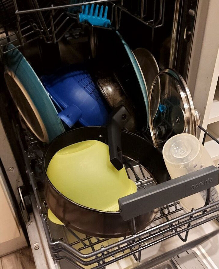 У подавляющего большинства посудомоечных машин нагревательные элементы находятся внизу. Именно поэтому производители советуют размешать там кастрюли, сковородки, ковшики и категорически не рекомендуют мыть в нижней корзине пластиковые изделия — контейнеры, бутылочки для воды, разделочные доски, акриловую посуду. Пластик может обесцветиться, деформироваться, а еще хуже — размягчиться, потечь и засорить фильтр.