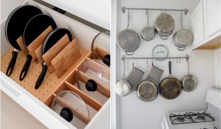 Такие органайзеры позволяют удобно разместить крышки и сковородки