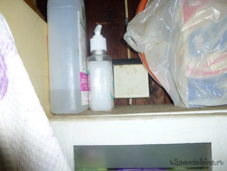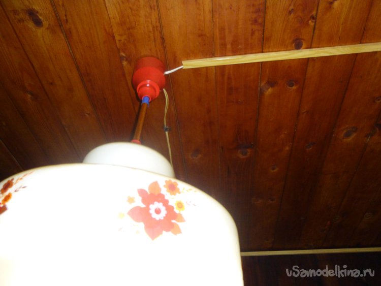 Предыстория такова. Покойный отец (да будет ему земля пухом!) когда-то давно повесил лампу в районе импровизированной кухни. Он ориентировался на розетку, от которой запитывался холодильник, провёл от неё провод вверх, поставил выключатель в разрыв провода, дальше до потолка, вывел на потолок и посредине потолка закрепил лампу.