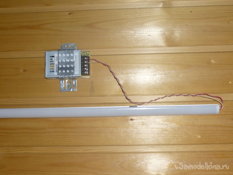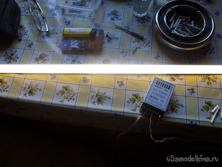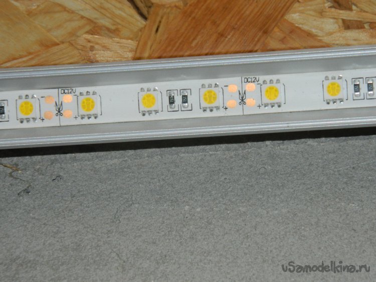 Я подпаялся к ленте (коннекторов у меня не было), вклеил её в профиль и собрал “на коленке” всю конструкцию, чтобы проверить в действие. Свет меня очень порадовал.