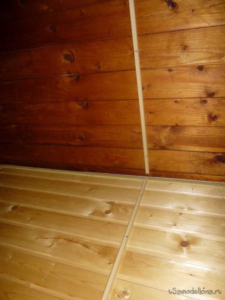 В гараже где-то лежали остатки электротехнических коробов 10х15 мм раcцветкой “сосна”, нашёл, принёс и закрепил на стене и потолке.