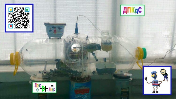 Доработанная панорамная кормушка для синиц (ДПКдС) Посмотреть видео «ДПКдС» размером 168 606 кБ, длительностью 6 минут и 22 секунды вы можете, кликнув на слово « ВИДЕО » или воспользовавшись QR-кодом. ВИДЕО Сокращения, принятые в статье ДПКдС - Доработанная панорамная кормушка для синиц (название статьи). ПКдС - Панорамная кормушка для синиц. ПХВ трубки - полихлорвиниловые трубки. УдПЦ-2 - Устройство для полива цветов – 2. Используется в качестве исполнительного устройства для датчика прилёта птиц. Из всех кормушек, изготовленных автором статьи в последние годы, наиболее удачной оказалась панорамная кормушка для синиц (ПКдС). Рисунки 01 и 02. При создании этой кормушки учитывались следующие требования. 1). Голуби, как более крупные и прожорливые птицы, не должны были мешать мелким птицам (синицам, поползням и воробьям) посещать кормушку. 2). Корм в кормушку должен засыпаться быстро (буквально за 2-3 секунды), чтобы на холодный балкон зимой можно было выходить даже в комнатной одежде. Автор всё же, не рекомендует без шапки выходить на мороз, так как надо беречь голову. 3). Птицы не должны пачкать кормушку, что для них противоестественно. Единственный способ, чтобы не позволить им заниматься этим «грязным делом» внутри кормушки – это постоянно держать птиц в тонусе. Залезть через узкое отверстие, удлинённое 20-сантиметровым коридорчиком, это конечно же стресс. Однако он не мешает им выбрать семечку и выскочить из кормушки. А вот времени «испачкать» кормушку уже не хватает: надо скорее лететь. А сделать вынужденный послеобеденный «моцион» (по мнению птиц) проще и безопаснее где-нибудь на ветке дерева или на открытом пространстве. Недавно балкон был отгорожен сеткой от голубей, сильно засоряющих балконный пол. Поэтому и надоконная кормушка для синиц оказалась также отгорожена сеткой. Кормушку для синиц пришлось перенести в другую половину балкона, закрытую армированной плёнкой для теплиц. В плёнке было проделано «окошко» размером 100 х 80 мм для входной части ПКдС. Окошко пришлось усилить двумя слоями такой же армированной плёнки для теплиц, так как синицы хотели проделать свой, неофициальный вход в кормушку. Пластиковый корпус кормушки им проклевать не удалось, а вот армированная плёнка поддаётся легче и однослойная плёнка, предназначенная для сохранения тепла, постепенно превращается в сито. 4). Кормушка должна быть прозрачной, чтобы можно было наблюдать за птицами и знать, когда подсыпать корм и (при заметном загрязнении) чистить кормушку. Да! Хотя и редко, но это приходится делать. Чаще всего, чтобы убрать шелуху от семечек (сильно загрязняют кормушку шелухой поползни). Идеальным вариантом по прозрачности был бы стеклянный аквариум, но это дорогое удовольствие. И кормушка была сделана из трёх пластиковых бутылей: двух на 6 литров и одной (для организации входа в кормушку) – на 4 литра. Рисунок 03. На рисунке 03 . Изображён момент превращение бутыли в прозрачный корпус для кормушки. В бутыль заливается горячая вода (не менее 65 … +70 ⁰С) и через 1-2 минуты этикетка легко отделяется с помощью пинцета. Если вода достаточно горячая, то весь клей с бутылки легко отделяется и остаётся на этикетке. 5). Кормушка должна быть повёрнута боком (большей, и максимально прозрачной стороной) к окну. Рисунок 04. На рисунке 04 кормушка прозрачна и имеет входное отверстие с тор