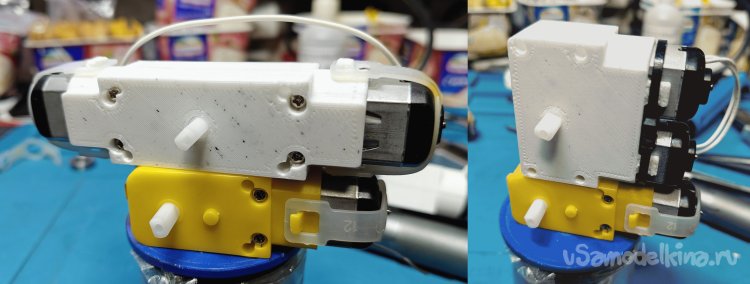 Здоровья и удачи вам, решившим потратить время на прочтение этого текста! Все кто когда-либо делал самоходные модели , наверняка имел дело с китайским моторчиком со встроенным редуктором « TT - motor » (он же «Желтый моторчик»). Вещица неказистая, но зато с лихвой покрывающая запросы нетребовательных самоделок, и при этом, что не маловажно, дешевая. Мощность его конечно небольшая, что, собственно, становится проблемой если масса модели становится заметной. Далее речь пойдет о версии « TT - motor » с передаточным числом 1:48 (по другим данным 1:45 – зубья у шестеренок не пересчитывал). Здесь я попытался увеличить мощность этого моторчика путем решения проблемы «в лоб» - посадить на один редуктор два двигателя с максимальным использованием компонентов исходного (вернее двух исходных) « TT - motor ». В конечном счете, получилось вот такое: Как видно, я сделал два варианта конструкции: с соосным расположением моторчиков и с рядным. Начнем с соосного. Двойной «TT-motor» с соосным расположением двигателей. Общий вид: Вид со снятой крышкой: Вид в разборе: Как исходный материал использованы два покупных « TT - motor » - от них взяты двигатели и хомуты для них, шестерни, оси и саморезы. Половинки корпуса распечатаны на 3 D -принтере из PETG -пластика. « Plastic pins » на картинке - это штифты из кусочков филамента ( Æ 1.75мм). Штифты (8 шт.), исключающие смещение половинок корпуса, вставлены в отверстия Æ 1.8мм, расположенные по периметру корпуса. Отверстия в половинках корпуса после печати необходимо очистить сверлом соответствующего диаметра, особенно тщательно в посадочных местах для осей шестеренок. Габаритные и присоединительные размеры: Двойной «TT-motor» с рядным расположением двигателей. Общий вид: Вид со снятой крышкой: Вид в разборе: Здесь также как исходный материал использованы два покупных « TT - motor » - от них взяты двигатели, шестерни, оси и саморезы. Хомуты от двигателей красиво приспособить не получилось, поэтому для фиксации моторчиков были использованы кабельные стяжки для которых сделаны специальные хвостовики (см. фото общего вида). Также к исходным надо добавить еще два самореза. Половинки корпуса также распечатаны на 3 D -принтере из PETG -пластика. « Plastic pins » на картинке - это штифты из кусочков филамента ( Æ 1.75мм). Штифты (5 шт.), исключающие смещение половинок корпуса, вставлены в отверстия Æ 1.8мм, расположенные по периметру корпуса. Отверстия в половинках корпуса после печати необходимо очистить сверлом соответствующего диаметра, особенно тщательно в посадочных местах для осей шестеренок. Габаритные и присоединительные размеры: Детали корпусов распечатаны на принтере "Tronxy-D01"пластика PETG. Модели можно скачать здесь:https://www.thingiverse.com/thing:7318961 На этом вроде как все. Удачи!
