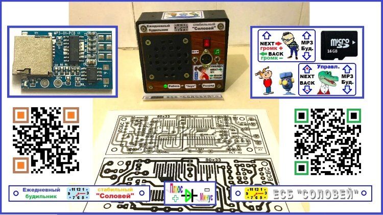 Но сначала, анонс №2 (ещё одно видео с фрагментами из новой книги): " Загадки электронной тематики " . Пока только в формате видеоролика, который называется «ЗЭТ_сезон_02» и имеет длительность 6 минут 22 секунды (размер 206 МБ). Это видео можно также посмотреть на мобильных устройствах с помощью QR-кода: Что нового в статье? 1). В качестве суточного таймера в схеме (см. рисунок 01 ) использован комплект из широко распространённой ИМС К176ИЕ12 и редко используемого «программируемого» делителя частоты КА561ИЕ15А. 2). ЕСБС питается от литий - ионного аккумулятора типоразмера 18650 ёмкостью 9900 мА/ч, с номинальным напряжением 3,7 Вольта. Для более полного использования ёмкости аккумулятора и большей стабильности в работе таймера, в ЕСБС применён микромодуль - преобразователь DC-DC 5 Вольт (на рисунке 01 это блок А2). 3). Для того, чтобы исключить разряд аккумулятора ниже допустимого уровня, ЕСБС оснащён индикатором разряда аккумулятора, выполненным на специализированной ИМС КР1171СП28. Устройство ЕСБС можно использовать в качестве автомата ежесуточного кратковременного включения нагрузки. А при замыкании канала «исток - сток» полевого транзистора VT1 тумблером SA3 «Режим» - в качестве долговременного проигрывателя музыкальных MP3 - треков с запоминающимися установками и регулировками. Сокращения, принятые в статье ЕСБС - Ежедневный стабильный будильник «Соловей» (название статьи). ИМС – Интегральная микросхема. ИРА – Индикатор разряда аккумулятора. К деления – коэффициент деления. Лог.0 – уровень логического нуля. Лог.1 – уровень логической единицы. ПП – печатная плата. Основной недостаток ЕСБС в том, что в нём программируемый счётчик DD3 КА561ИЕ15А при включении питания выводится на заданный К деления по упрощённой схеме. Это позволило немного уменьшить размеры ПП. [При этом на вход К2 (вывод 13) DD3 уровень лог.1 подаётся не через 3, а через 4 тактовых импульса, следующих с частотой 2 Гц]. Перечень элементов «Самодельная» часть схемы ЕСБС состоит из: - часовой специализированной микросхемы DD1 К176ИЕ12; - элементов R1, R3, C1, C2, являющихся элементами «обвязки» встроенного в ИМС DD1 задающего генератора; - часового кварцевого резонатора BQ1, рассчитанного на частоту 32678 Гц; - стартовой цепи обнуления счётчиков, состоящей из элементов С3 R4; - индикаторной цепи HL2 R5, в которой зелёный светодиод HL2 мигает с частотой 1 Гц (вырабатывает меандр); - керамического конденсатора С4, устраняющего возможные импульсные помехи, и оксидного конденсатора С5 ФПТ; - индикатора разряда аккумулятора, собранного на элементах DA1, R2 и красном светодиоде HL1 «Разряд»; - двоичного счётчика DD2 564ИЕ11, начинающего счёт сразу при включении питания с нуля до десятичного кода «8» и остающегося в этом состоянии вплоть до выключения питания. DD2 нужен для стартового выведения программируемого счётчика DD3 на расчётный К деления. - логического элемента «2ИЛИ», собранного на дискретных элементах VD1, VD2, R6 и обеспечивающего коммутацию двух сигналов (2 Гц и 1/60 Гц) для их поочерёдного (однократного) прохождения на тактовый вход С (вывод 1) счётчика DD3; - счётчика DD3 КА561ИЕ15А с «запрограммированным» К деления 1440; - токового ключа VT1, собранного на полевом транзисторе КП505А с изолированным затвором; - трёхпозиционного тумблера SA2 типа MTS-103, предназначенного для управления музыкальными треками и их громкостью; - стоковой нагрузки полевого тр