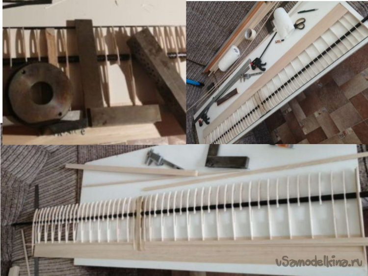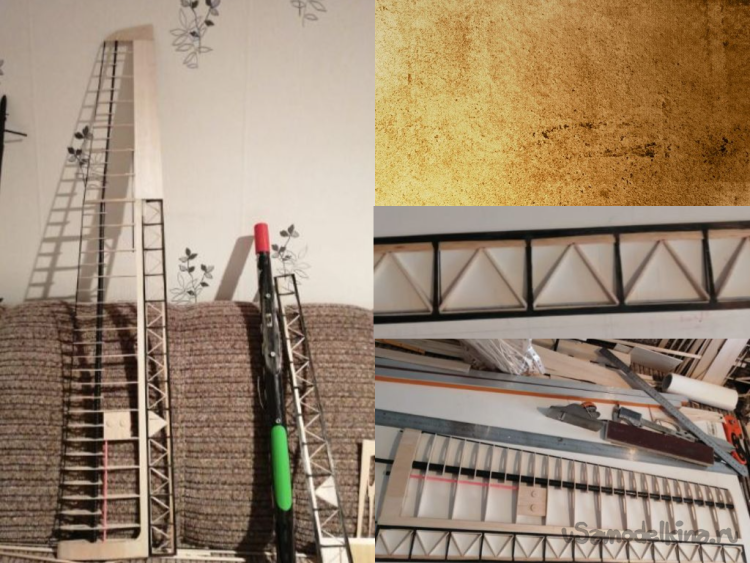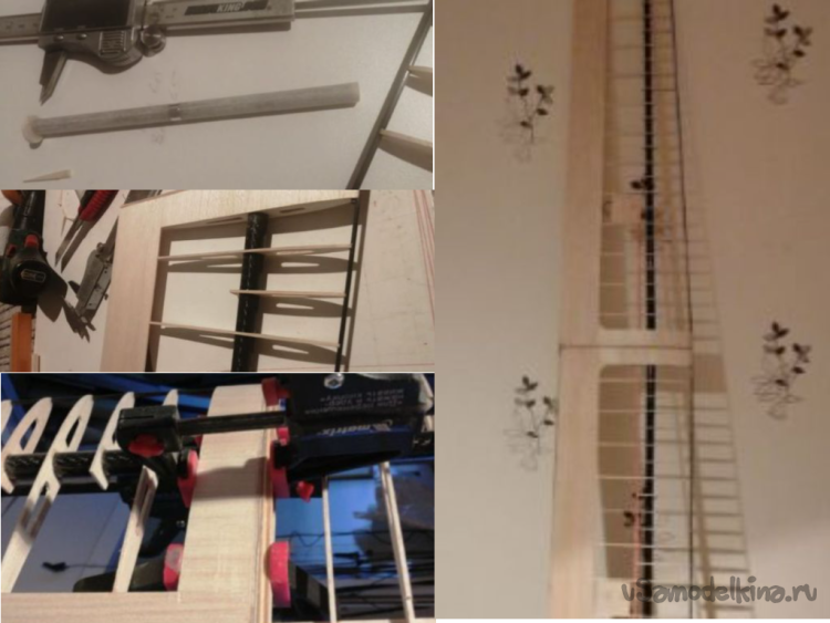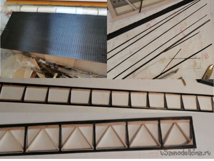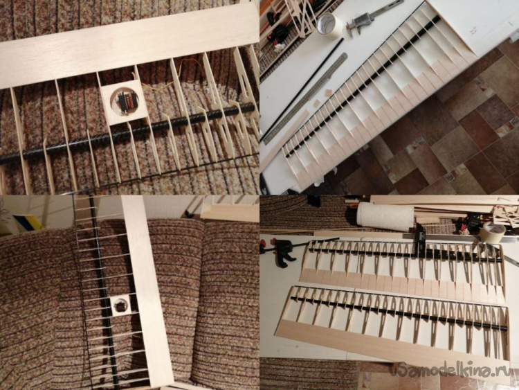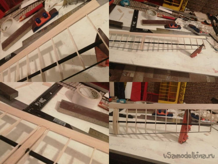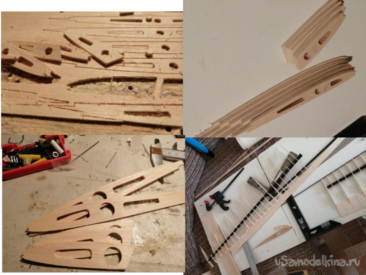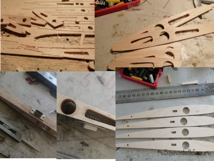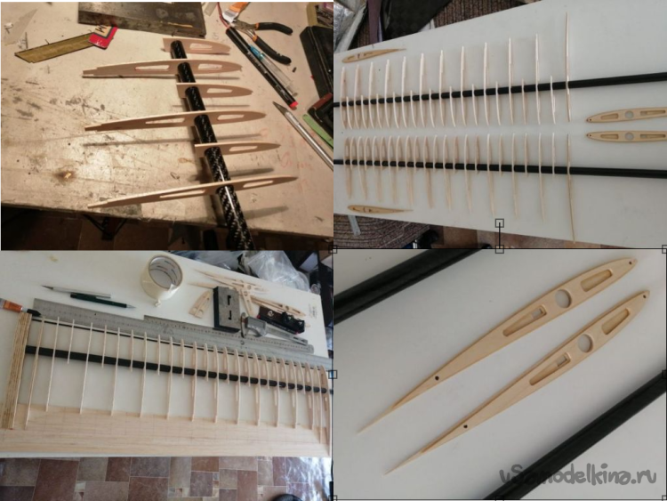 Очистив заготовки нервюр с помощью шкурки, начинаем собирать конструкцию центроплана на уже изготовленных карбоновых трубках.