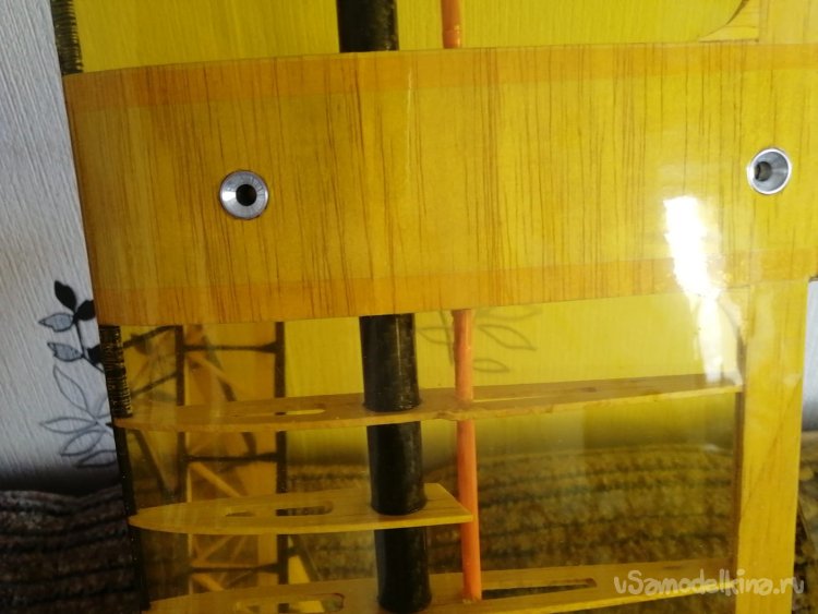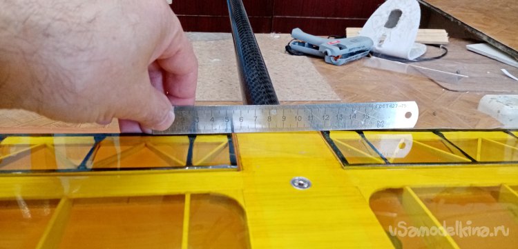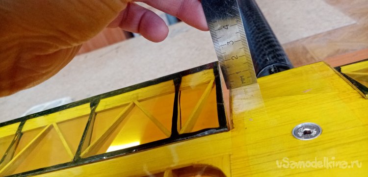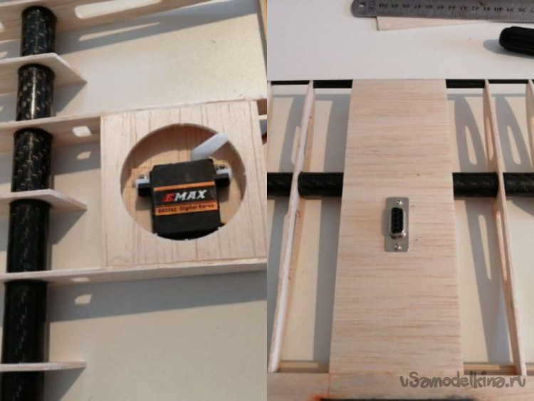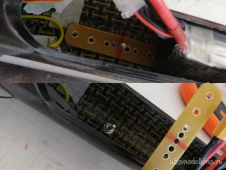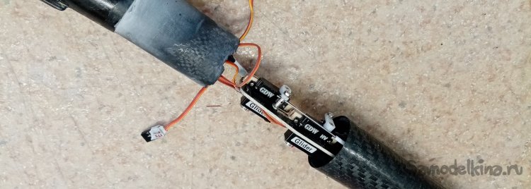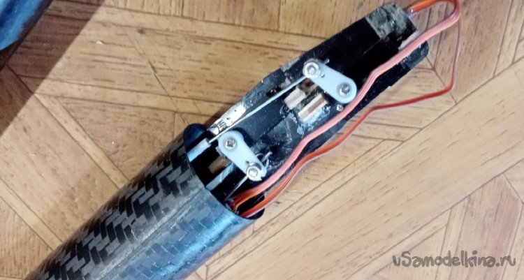 Сама балка отъемная для удобства транспортировки. Но с секретом. Сервоприводы управления и тяги на рудер и элеватор расположены на карбоновой площадке в месте рассоединения хвостовой балки и фюзеляжа. Это позволяет немного сдвинуть центр тяжести вперед и оперативно контролировать работоспособность сервопривода. Тяги из нержавеющей проволоки помешены во фторопластовые трубки и прижаты внутри балки при помощи жесткого поролона.