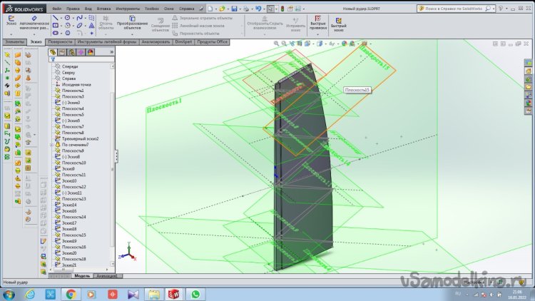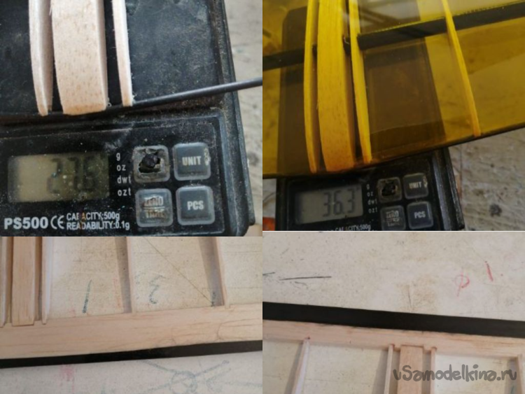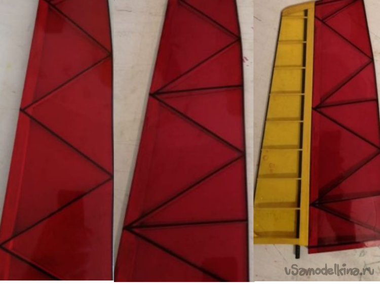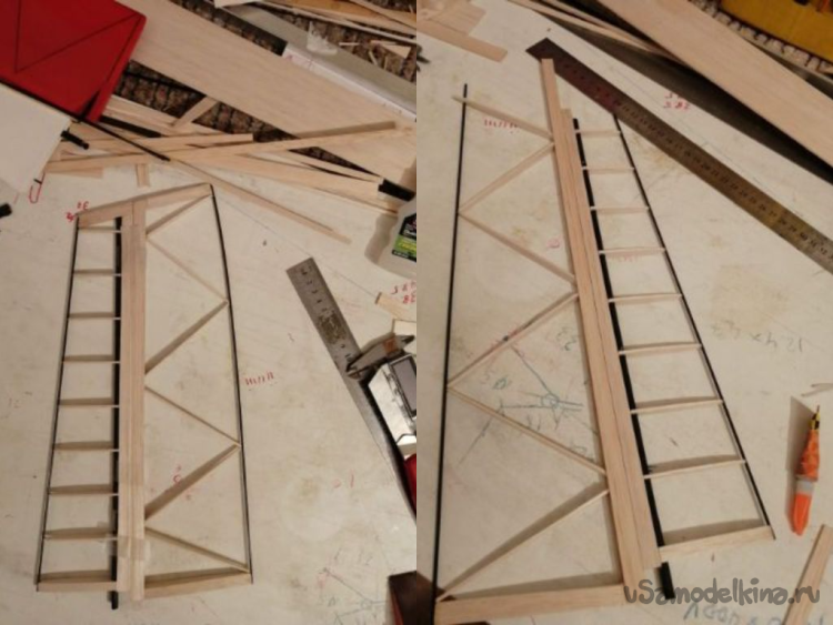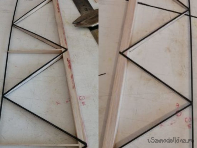 Сейчас нужно изготовить рудер и элеватор с той же концепцией максимального веса. Проектируем. Распечатываем чертеж. Вырезаем нужное количество деталей из легкой бальзы и начинаем собирать. Основной силовой элемент рудера – трубка из хлыстика от удочки. Опять режем на полоски нашу пластину угольную и приклеиваем усиления на все элементы конструкции.