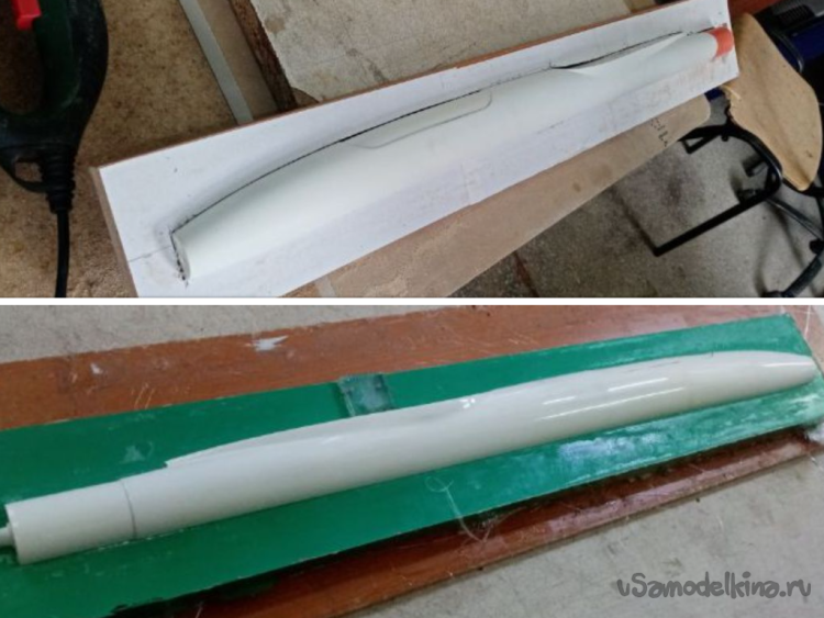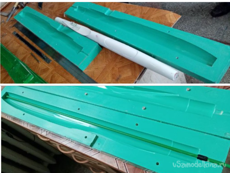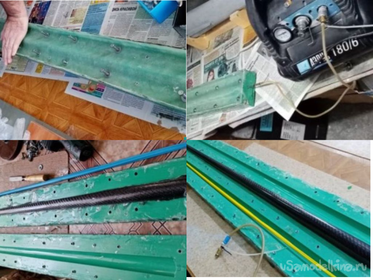 6 первые два слоя шахматки затем спред. Закладываем вторую половинку фюзеляжа. Выкраиваем материал на 8 мм больше формы. После пропитки смолой аккуратно обматываем матрицу нитками и загибаем выступающие края внутрь. Затем укладываем трубку с резиновым расширителем и закрываем матрицу. Осторожно извлекаем нитки. И выступающие бортики склеиваются со второй половиной фюзеляжа. Скручиваем половинки матрицы. Для уплотнения корочки подаем давление в резиновую трубочку расширителя. 6 атмосфер. После суток выдержки под давлением осторожно разбираем матрицу. Получился не плохой фюзеляж.