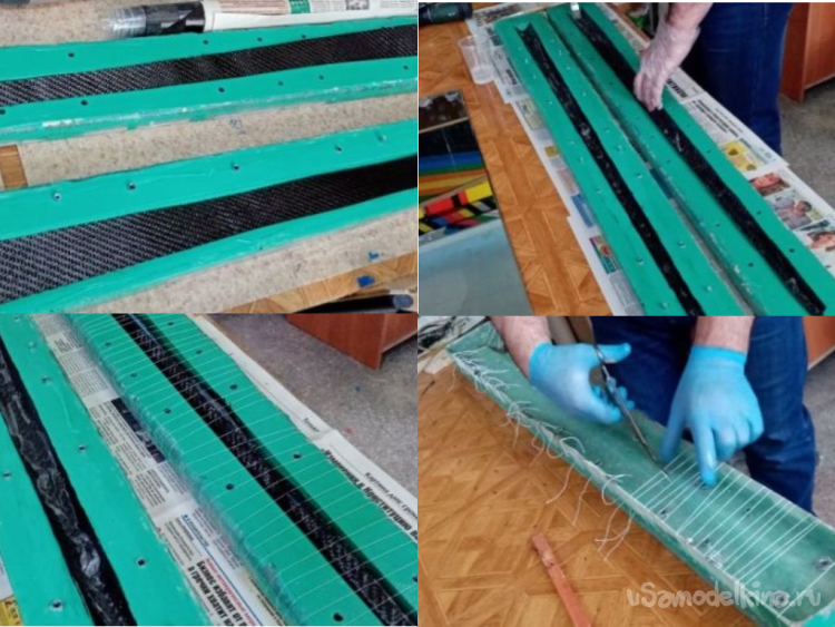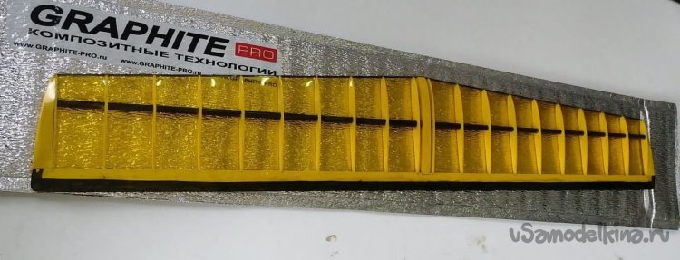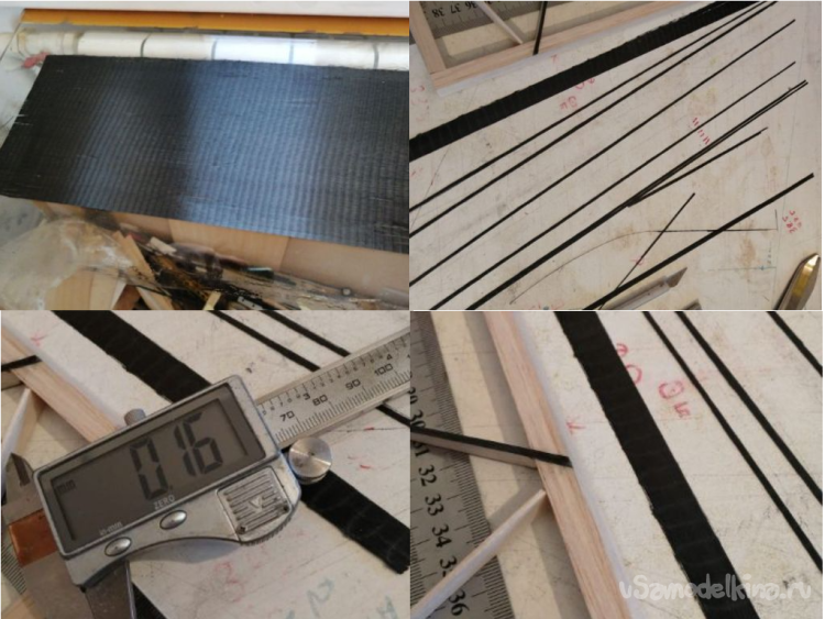 Но смущает довольно массивная задняя кромка крыли и флапероны с элеронами. Принимаем решение отрезать от крыла эти элементы и переделать на более легкий вариант. Из парочки слоем углеткани формируем пластинку на эпоксидной смоле. Пропитываем ткань и зажимаем между пластинами под грузом. Затем разрезаем на полоски усиления для флаперонов и элеронов. Для изготовления элерона с сужением, изготовили простой кондуктор из алюминия. Зажимаем нужное количество заготовок и обтачиваем до нужного размере. Затем собираем конструкцию на циакрине и приклеиваем полоски усиления. Таки изощренным методом добились уменьшения веса элементов в три раза примерно.