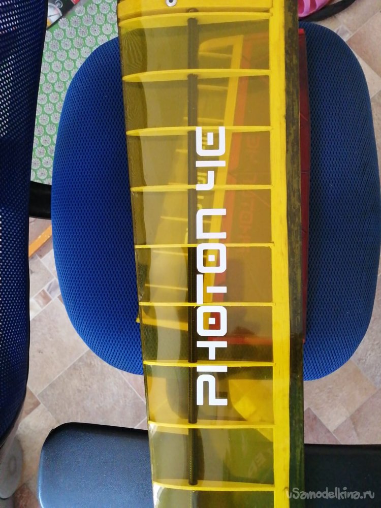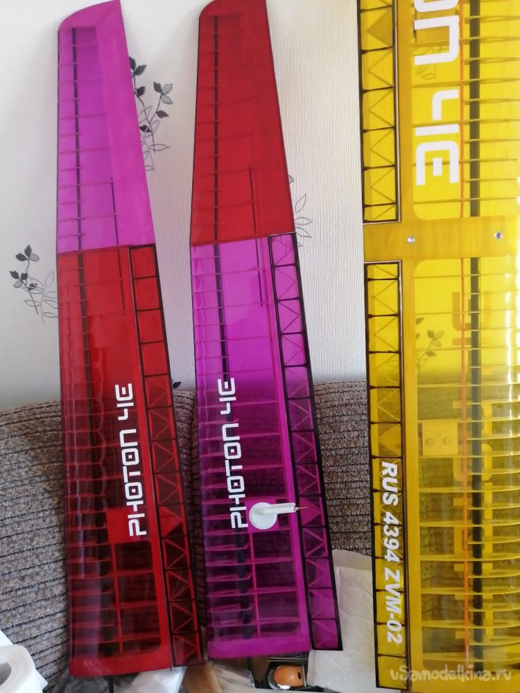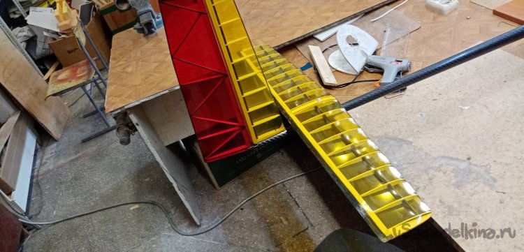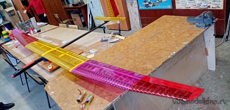 Центроплан с ушами и элеронами готов. Нужно обтянуть. Захотелось прозрачной пленки. Заказываем нужные цвета и бодро оклеиваем. Крылья готовы.
