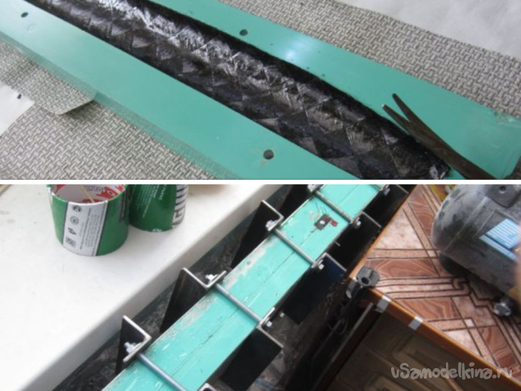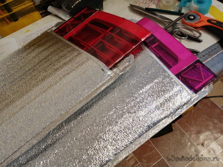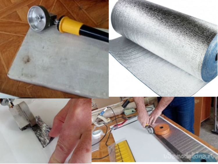 Неторопясь вырезали из утеплителя чехлы для крыльев. Внутри пленка для теплиц, внешний защитный слой из утеплителя толщиной в 2 мм. Сваривали самодельной приладой к паяльнуку. Колесико нагревалось и сваривала пленку и утеплитель.