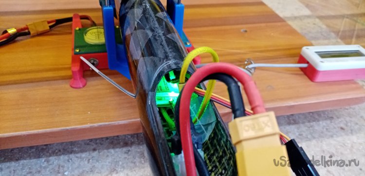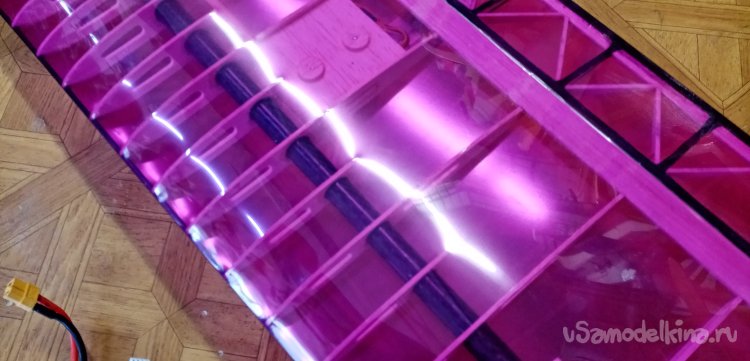 Также внутри фюзеляжа установлено крепление для грузов которые позволяют корректировать центр тяжести в зависимости от полетных условий. В идеальных условиях летим без грузов, примерно 50 грамм легче.