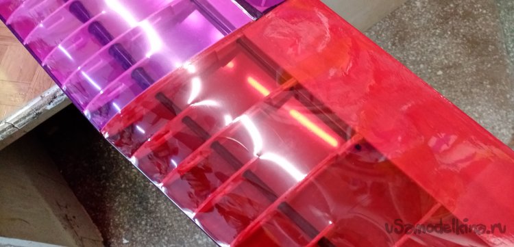 Готовая конструкция задута праймером для пластика. Выровнена автомобильной шпаклевкой и затем покрыта двухкомпонентной автомобильной эмалью на 5 слоев. Промежуточная сушки и полировка присутствовала. Получилась мастер модель. С которой была изготовлена матрица с примением гелькоута, эпоксидной смолы и стеклорогожи в 200гр на м2.