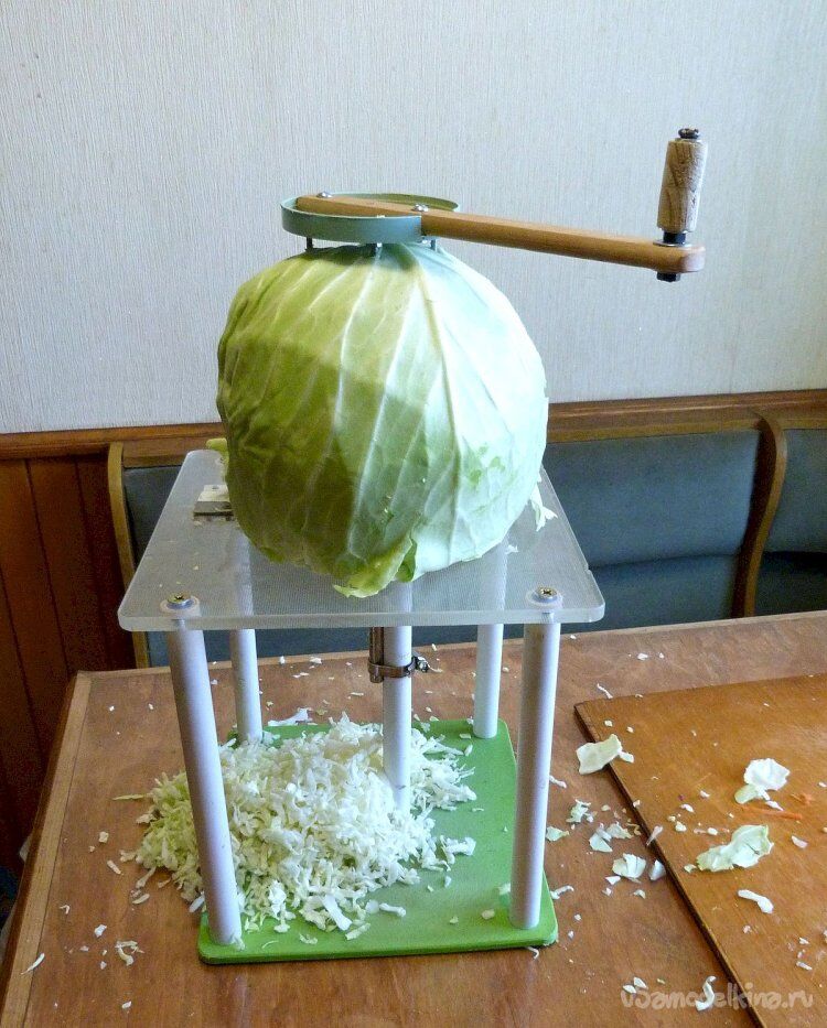 Вот и подошла пора закваски капусты. Шинковать её ножом долго и утомительно, посему этот процесс желательно механизировать. В интернете достаточно много конструкций самодельных капусторезок, и тем не менее хочу добавить свою разработку. Основное её отличие от предлагаемых конструкций, это регулировка ножа, что позволяет получать шинкованную капусту разных фракций. Для изготовления использовались вполне доступные материалы. Капусторезка состоит из пяти основных частей - 1) Основание. Изготовляется из любого плоского материала. Я использовал пластиковую разделочную кухонную доску. 2) Стойки. Изготовлены из полипропиленовой трубы Ø 20мм. Для упрощения конструкции можно изготовить из деревянных реек. 3) Рабочая поверхность. Также можно изготовить из любого плоского материала. Я для этой цели использовал оргстекло толщиной 8 мм. оставшееся от скончавшегося монитора. 4) Подвижный нож. Изначально в качестве ножа предполагалось использовать нож от электрорубанка, но в процессе эксплуатации выяснилось, что угол заточки этого ножа для резки капусты несколько велик, и поскольку возможности переточить его на более острый угол у меня не было, изготовил другой нож из полотна старой ножовки по дереву. 5) Водило (крутило:) Используется любой металлический прут подходящего диаметра и длины. Я использовал толкатель от старого пистолета для герметика. Который отлично подошёл к направляющей трубке по диаметру. В качестве направляющей, использовал стальную хромированную трубку Ø 10 мм. Для изготовления использовался стандартный набор инструментов самодельщика - дрель, электролобзик, отвёртка, метчики. Изготовление: 1) Основание. Просто вырезается из пластиковой разделочной доски. К низу основания крепятся противоскользящие накладки. Появилась идея вместо этих накладок использовать вакуумные присоски, используемые для крепления чего-либо к кафельной плитке. Но идея ещё не проверялась. 2) Стойки. Как упоминалось, изготовлены из полипропиленовой трубы Ø 20 мм. Для крепления к основанию и рабочей поверхности, в верхнее и нижнее отверстие каждой стойки забиты пластиковые дюбеля 12 мм, и в эти дюбеля забиты следующие дюбеля - 8 мм. в которые и вкручиваются крепёжные шурупы. Для улучшения внешнего вида, лучше использовать мебельные конфирматы. Но в момент изготовления их в наличии не оказалось, а идти в магазин было лень. Пришлось использовать то, что было под рукой. 3) Рабочая поверхность. Для изготовления рабочей поверхности было выбрано оргстекло из тех побуждений, что в нём можно легко нарезать резьбу для крепления подвижного ножа, что упрощает конструкцию и отменяет использование гаек. Легко моется и имеет скользящую поверхность. Изготовление так-же не предполагает никаких сложностей. На рабочей поверхности просверливаются отверстия для крепления стоек, направляющей трубки и вырезается окно для подвижного ножа. 4) Подвижный нож. Самый сложный узел в данной конструкции. Из того-же материала, что и рабочая поверхность (в данном случае - из оргстекла) вырезается пластина, на 1,5 см. меньше по ширине, и на 2 мм. меньше по длине, чем вырезанное окно в рабочей поверхности. К этой пластине винтами с потайной головкой крепится нож. Поскольку пластина вырезана из оргстекла, была возможность нарезать в ней резьбу, и в эту резьбу вкручивать винты. Сам нож выр