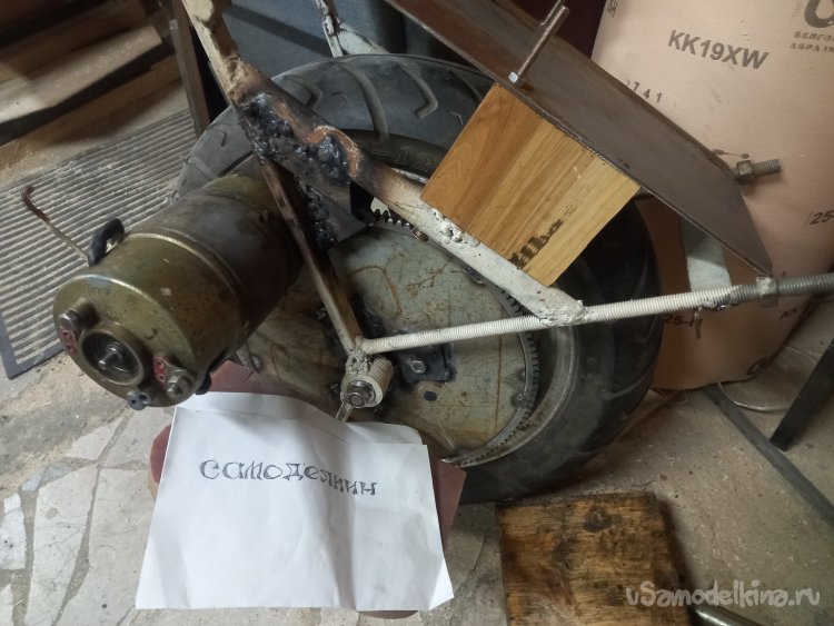 Расстояние между зубьями двигателя и колеса составило от ста сорока миллиметров. Но после подсчетов плюсов и минусов решил двигатель вынести в бок. Площадку двигателя с двигателем расклинил в раме транспортного средства. Убедился, что зубья двух шестеренок правильно расположены, сваркой проварил раму и площадку двигателя. Убрав клинья, прокутил колесо. По шуму, так же как и с цепной передачей, слышно но не раздражает. На вид, ну прям маховик и стартер. Двигатель с боку нормально вписался, нога становится удобно, ничего не мешает, а заодно в верхней части освободилось место под аккумуляторы.