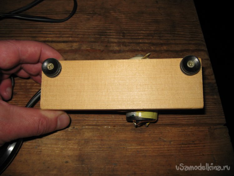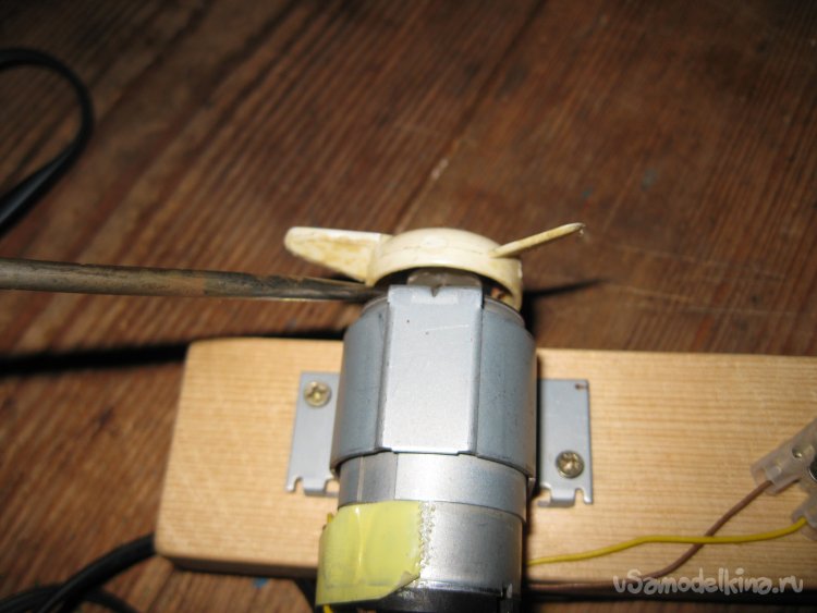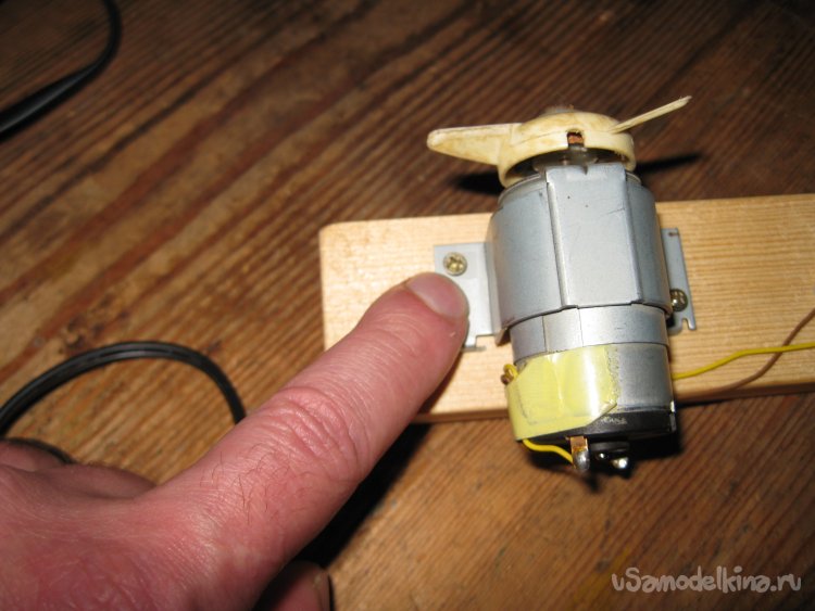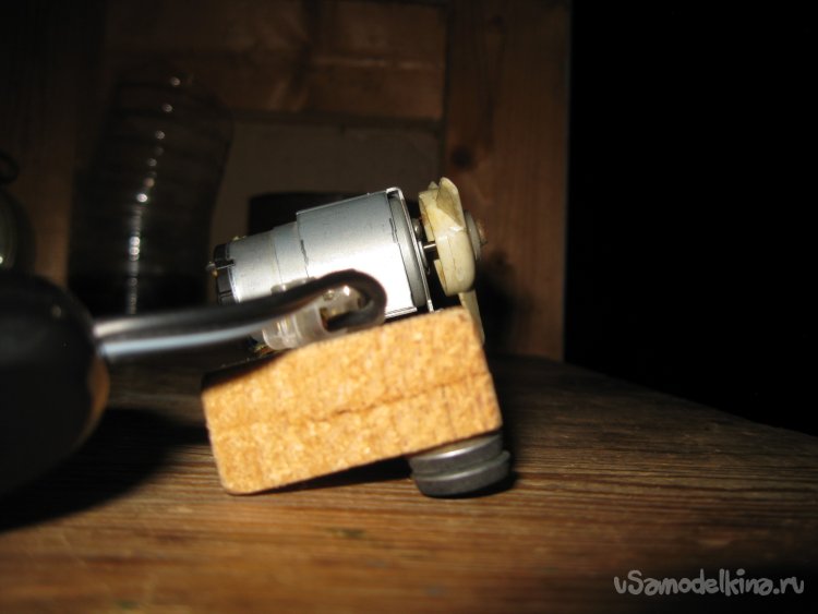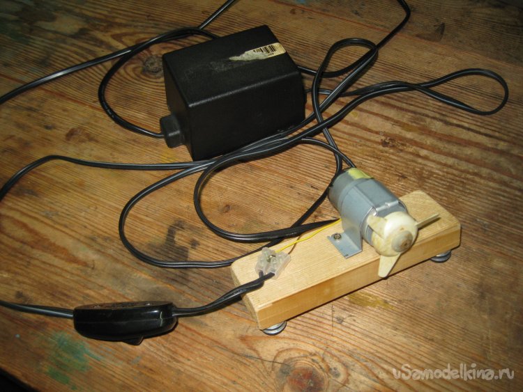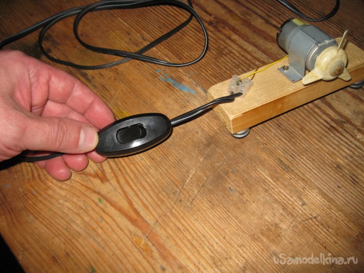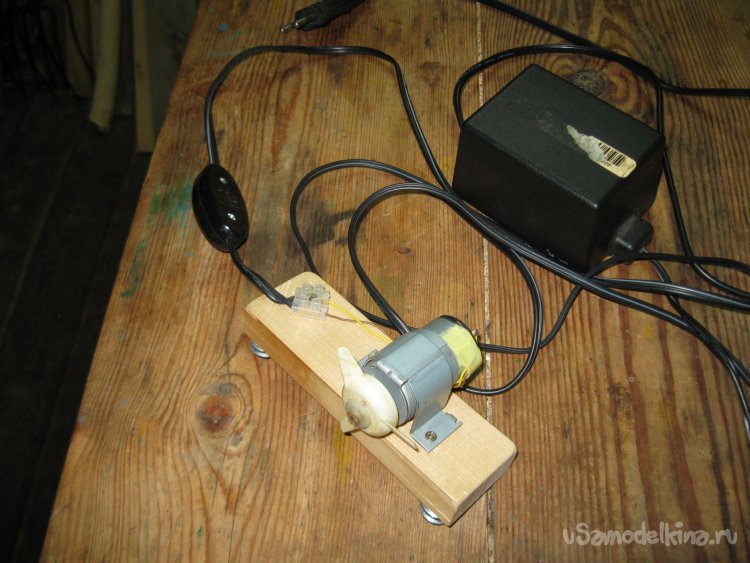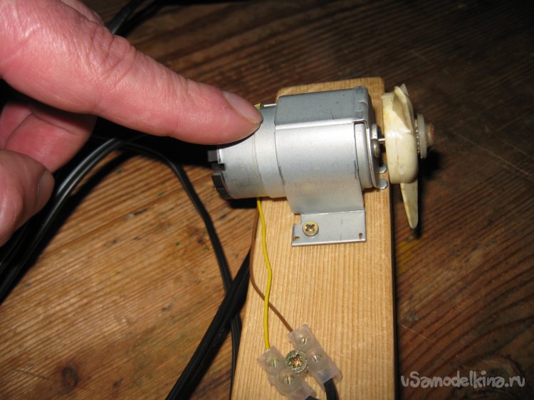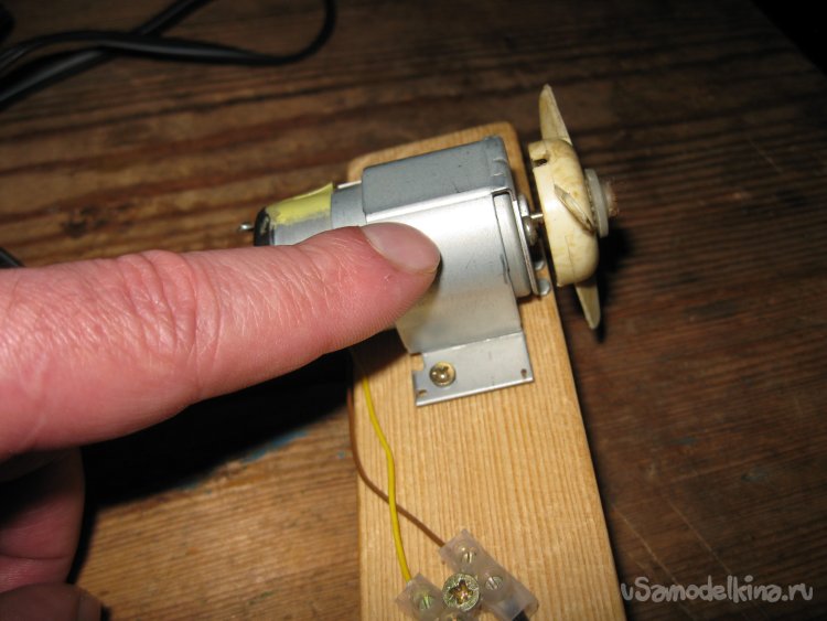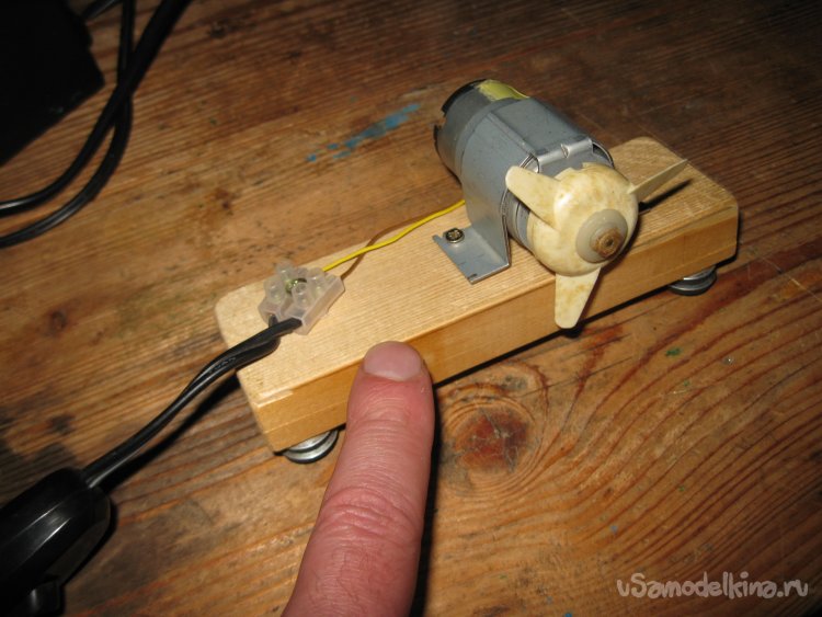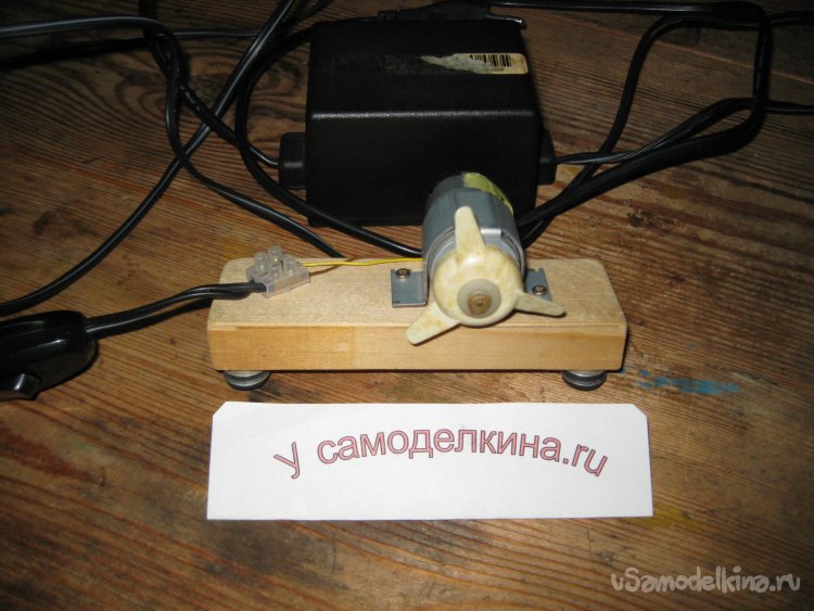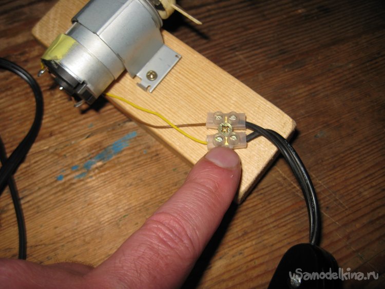 Затем я соединил провода адаптера и электродвигателя при помощи клеммы, которую закрепил на бруске.