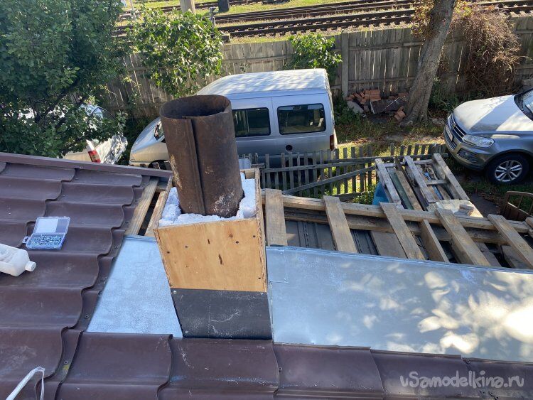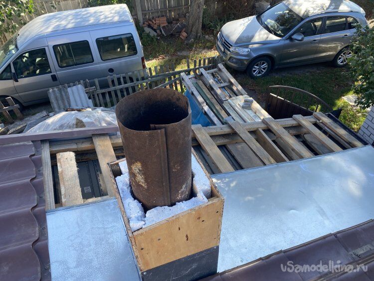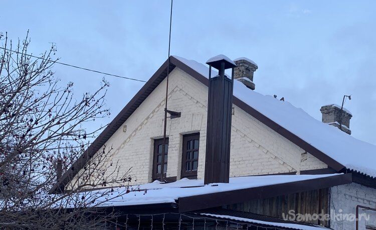 А потом Протёр грязные листы, закрыл углы уголками и опять замазал внизу стыки кровельным герметиком. И, как выяснилось, не сфотографировал результат! ))). А сейчас зима и это всё покрыто снегом! Да и не хочется по такой погоде тащить лестницу и лезть на крышу! Так что, поверьте уж на слово.)))) Там всё надёжно! Уже проверено многими дождями и многими топками. Утепление справляется отлично. По крайней мере, даже при многочасовой топке снег на крыше у основания дымохода не таял! То есть, прогревается только внутренняя труба. Поэтому и тяга сильная. В общем, результатом я доволен.