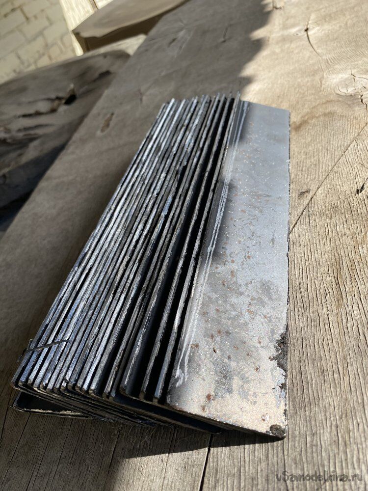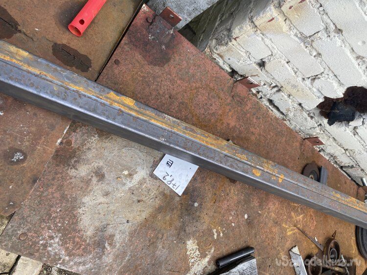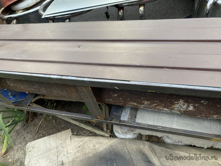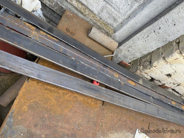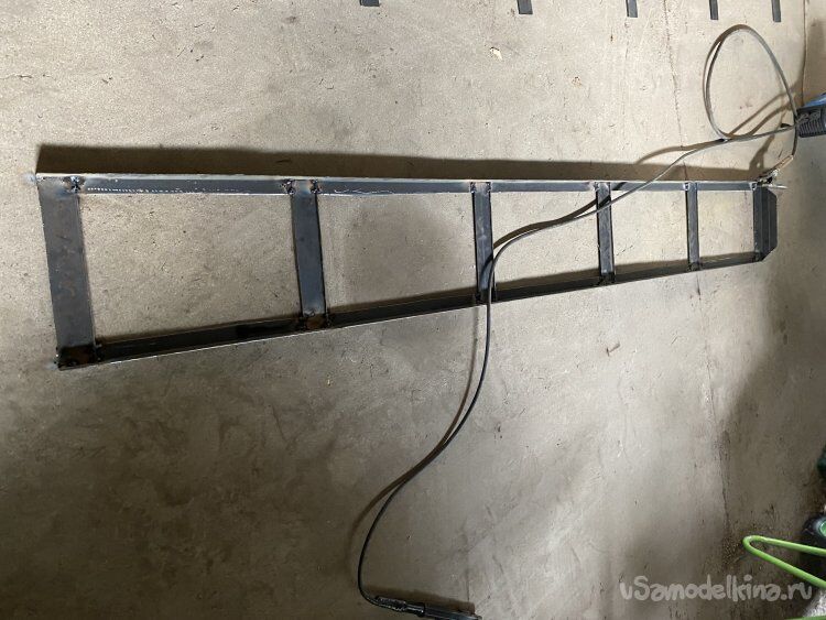 Значит, необходимо сделать жёсткий, но, относительно лёгкий, каркас. Если использовать стальной уголок и стальную полосу, то каркас получится слишком тяжёлым. Поэтому, я изготовил и уголок и полосу сам, распустив вдоль два трёхметровых отрезка профильной трубы, сечением 50х50 миллиметров, с толщиной стенки всего два миллиметра: