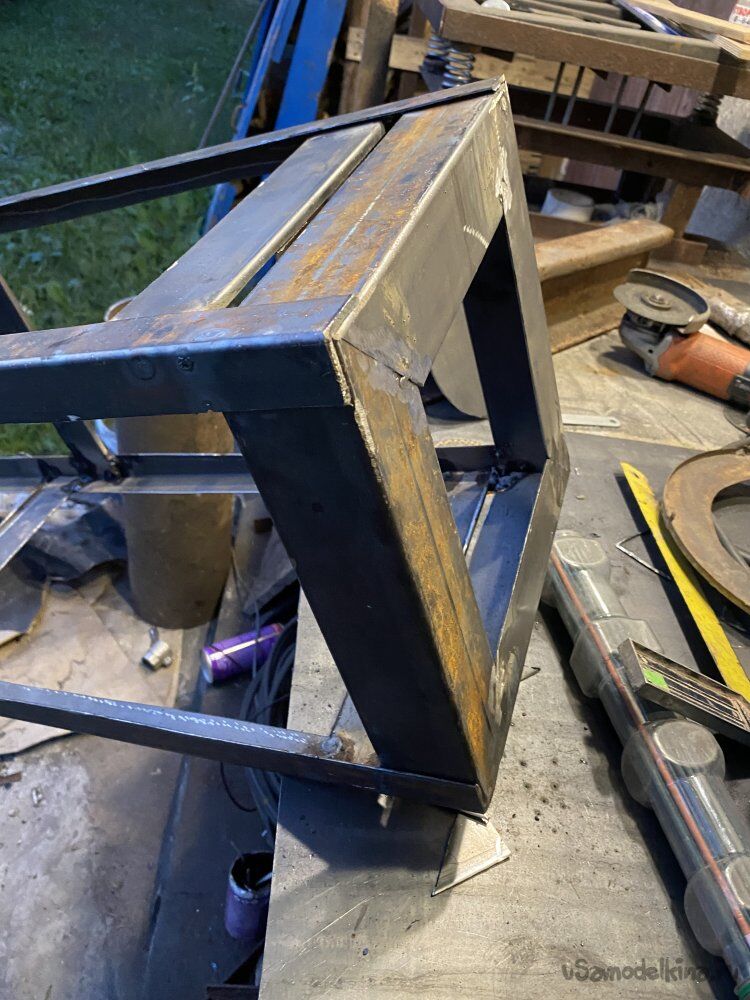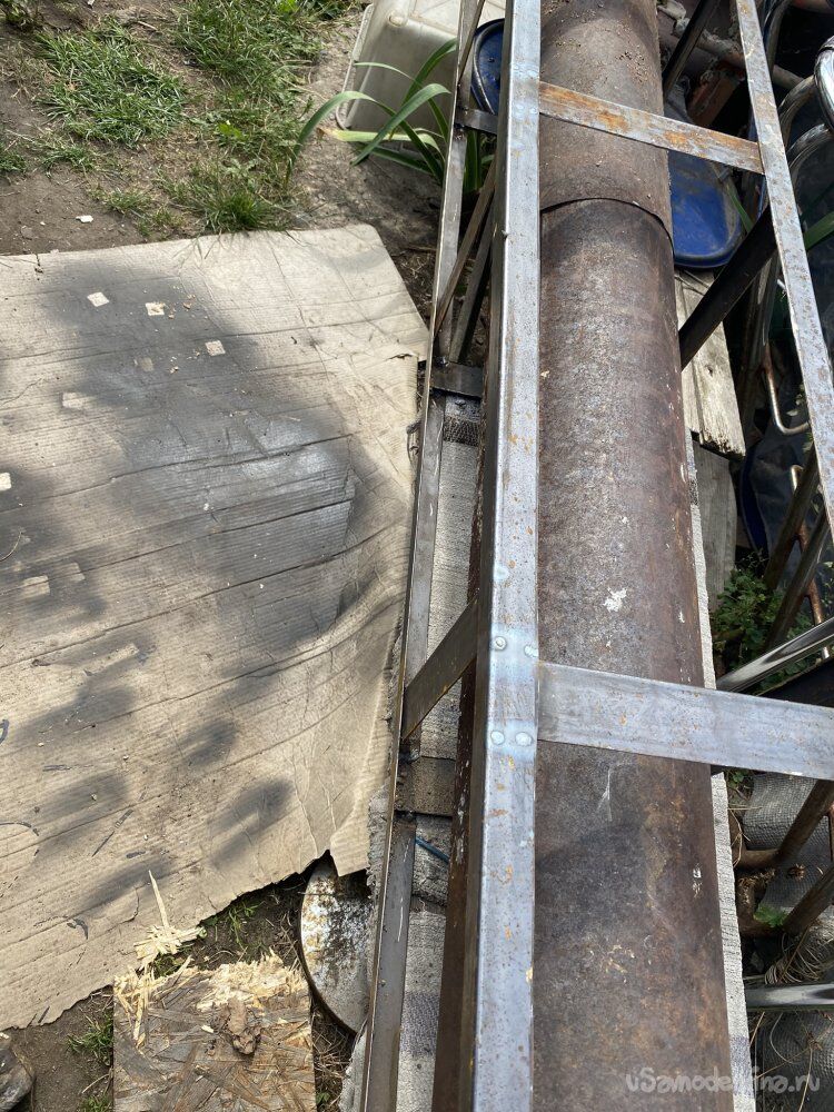 И полностью сварил каркас, вставив остальные отрезки полосы между "лесенок". С туб посбивал фланцы, соединил их, вставив одну в другую и вложил в каркас: