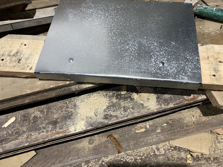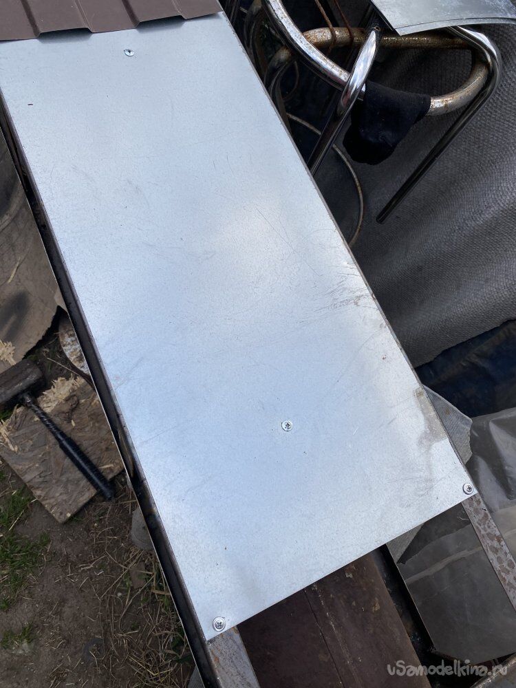 К обрешётке оцинковку не крепил. Это даст возможность чуть корректировать, если понадобится, вертикальное положение дымохода, когда я заменю им шаблон. А после этого, листы закрепятся кровельными шурупами, которыми я буду прикручивать, установленный на свое место, лист металлочерепицы.