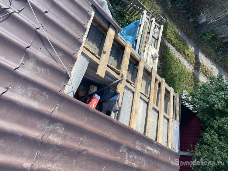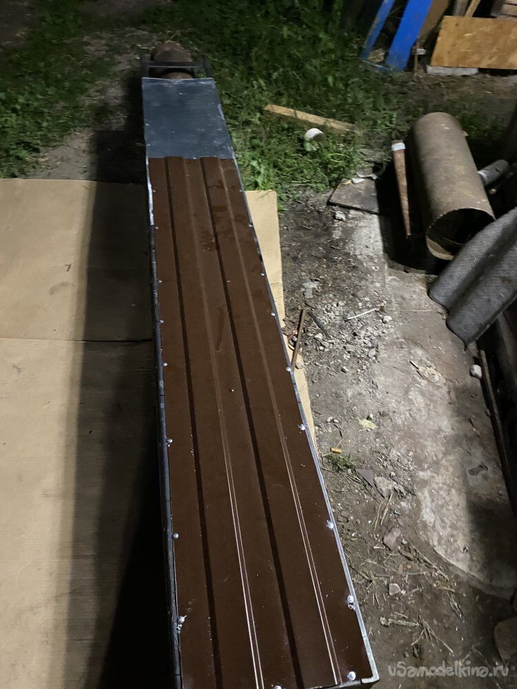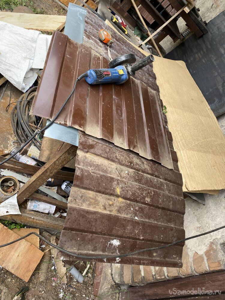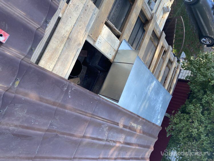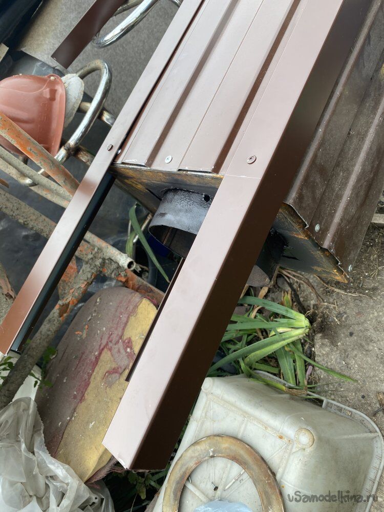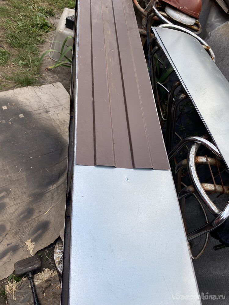 Теперь осталось прикрутить недостающие, нижние листы профилированного листа, подсадив их под верхние, и, подрезая по месту, опустить внизу до самых горизонтальных плоскостей примыкания. Что я и сделал. Профлист не покупал. Поковырявшись в запасах, нашёл подходящие обрезки:
