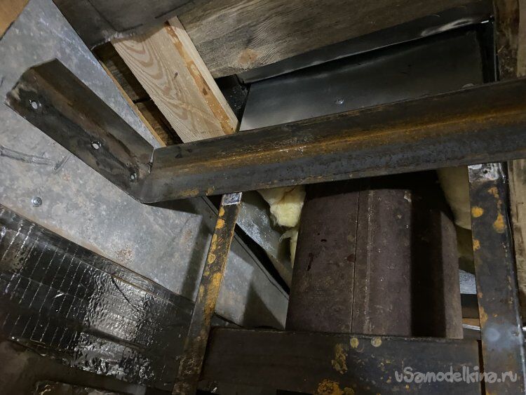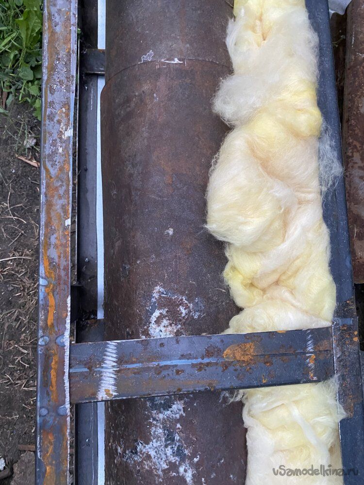 Когда я делал дымоход для печки в сарае, я не делал никакого каркаса для наружной стенки дымохода. Там всё делалось проще.))) Я просто поместил трубу дымохода в короб из жести и забил стекловатой. Но здесь, во-первых, дымоход будет у всех на виду, во-вторых, его высота будет больше двух метров. Если я не хочу закреплять его тросовыми растяжками (А я очень не хочу))), то нужно сделать его жёстким, чтобы он надёжно стоял, будучи закреплённым только в нижней части.