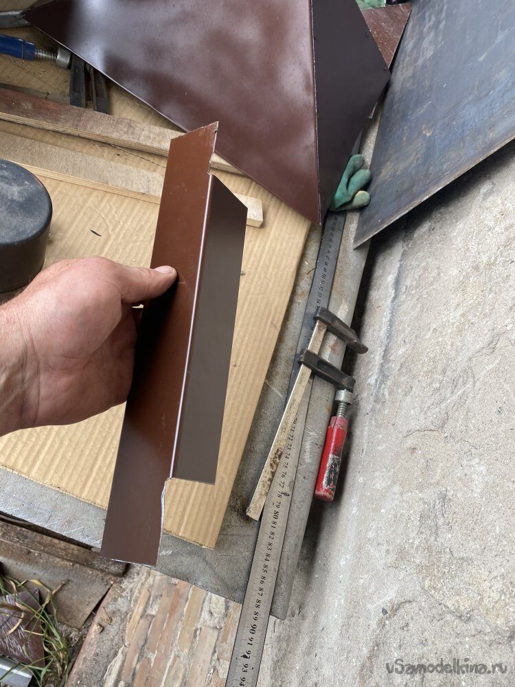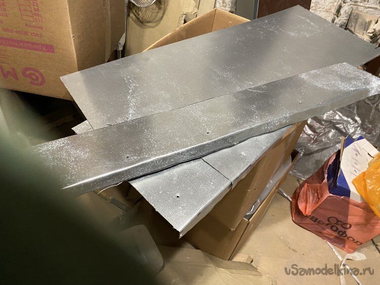 Сняв все размеры, из оцинковки изготовил планки примыкания. На этот раз просто вырезал все заготовки, загрузил их в минивэн и поехал к знакомому, у которого на даче есть листогиб.