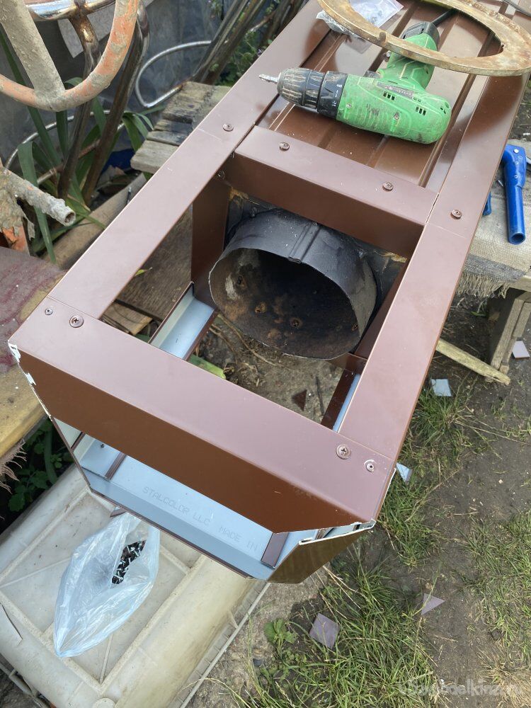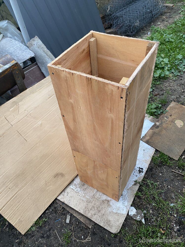 У меня была тарная фанера, использовавшаяся в виде прокладок между слоями товара на поддонах, которую подобрал когда-то на одной из фирм. Из неё я и соорудил короб, сечением точно повторяющий сечение нижней, оббитой оцинковкой, части моего дымохода: