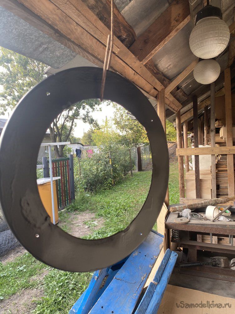 Выбрал один поцелее, и одел на трубу изнутри конструкции. После чего, прихватил сваркой. Так я закрепил трубу в центре каркаса: