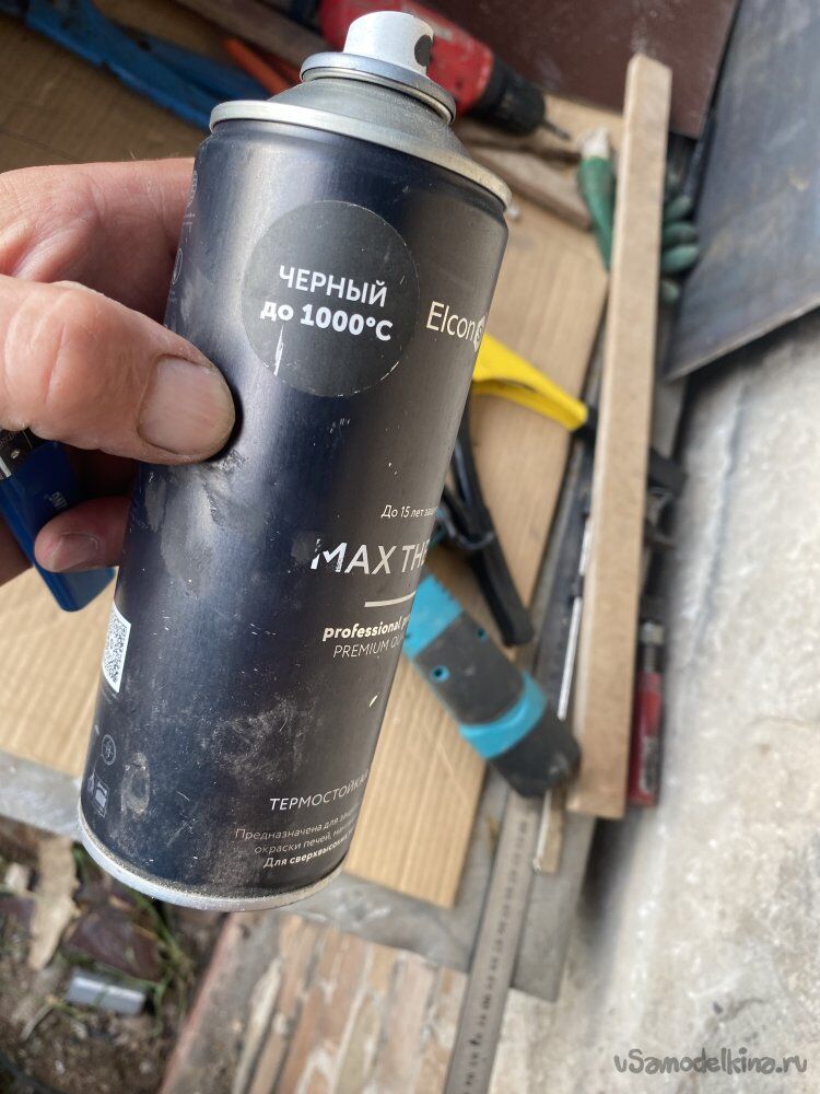 Выбрал ещё один фланец, покрасил его чёрной термоэмалью, и прикрепил на трубу, скрыв прорехи: