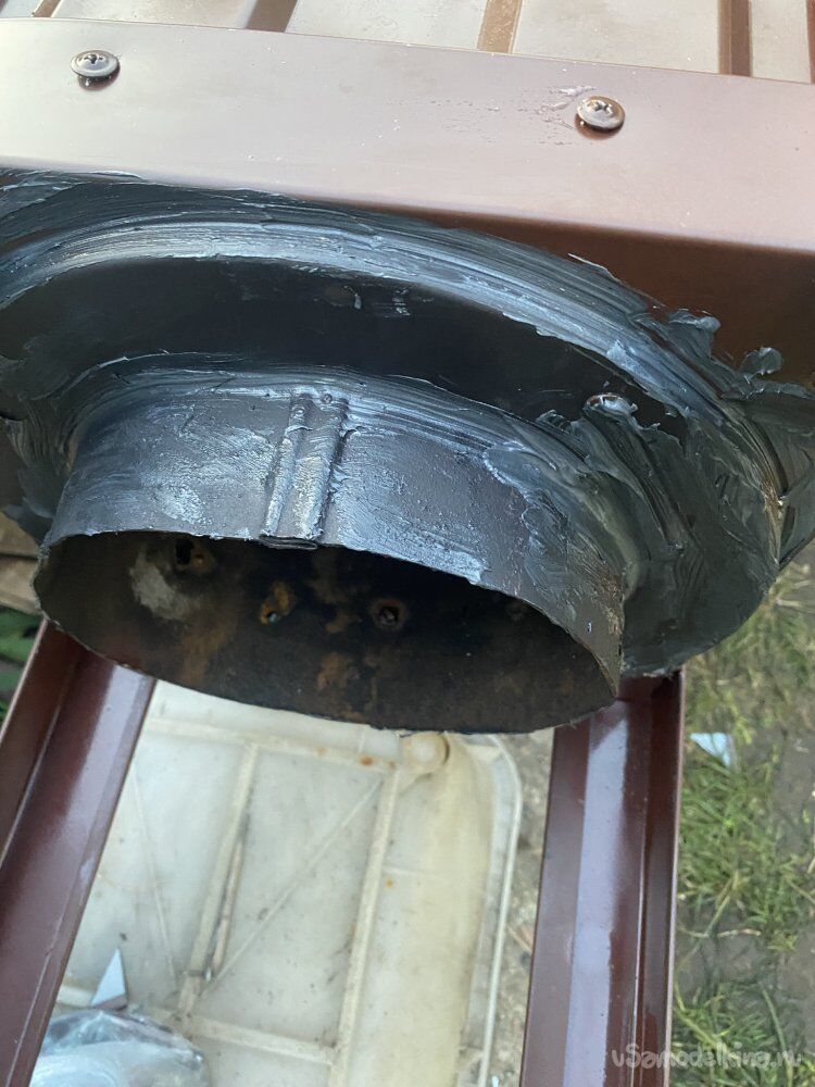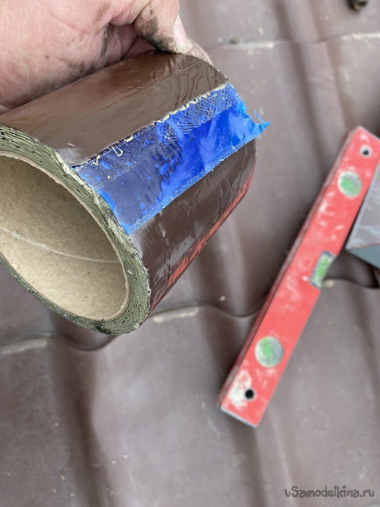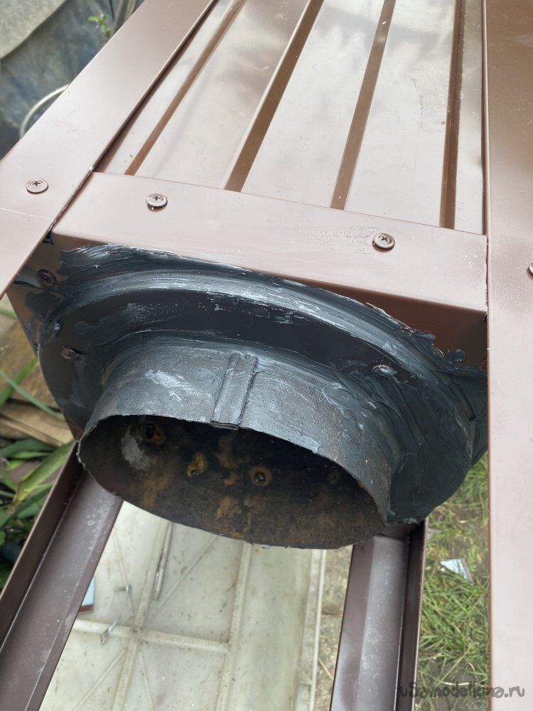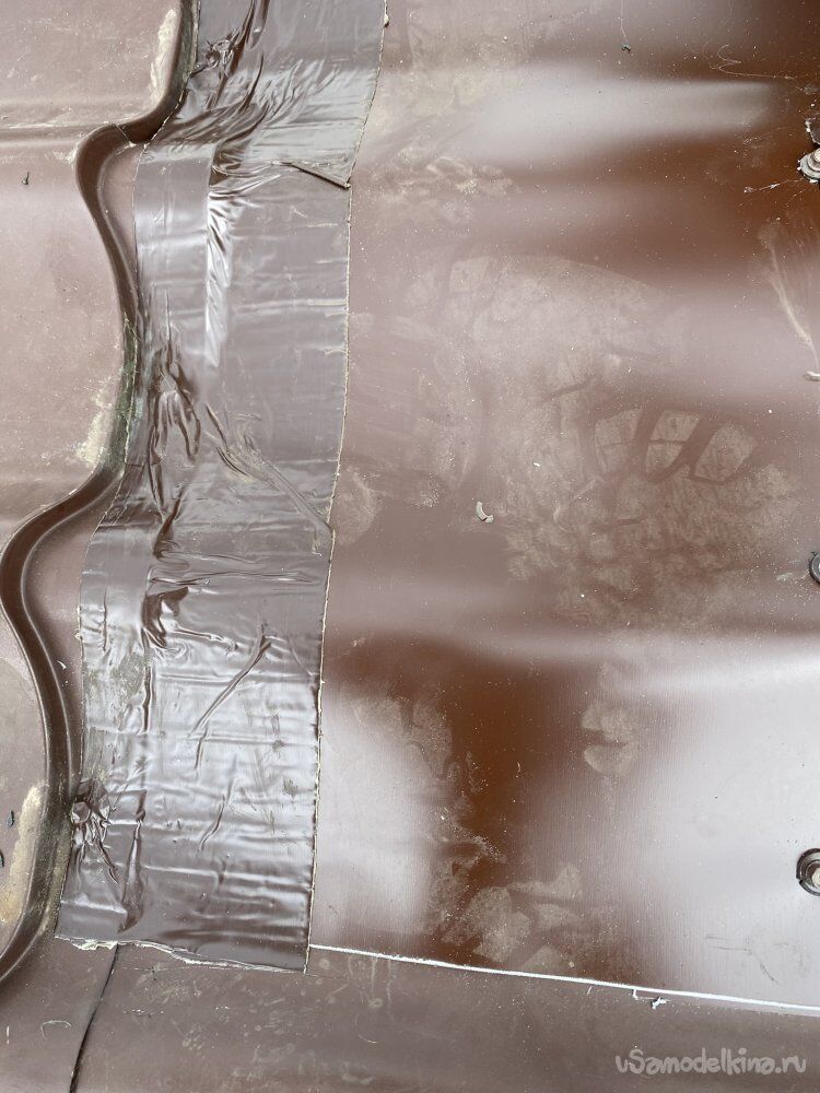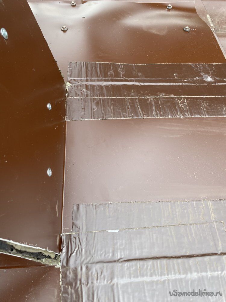 Все элементы тоже склевал между собой кровельным герметиком. А поверху все стыки проклеил кровельной армированной битумно-полимерной самоклеющейся лентой. Эта лента наглухо присыхает и надёжно герметизирует все стыки. Продаётся разных цветов по RAL.