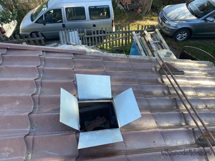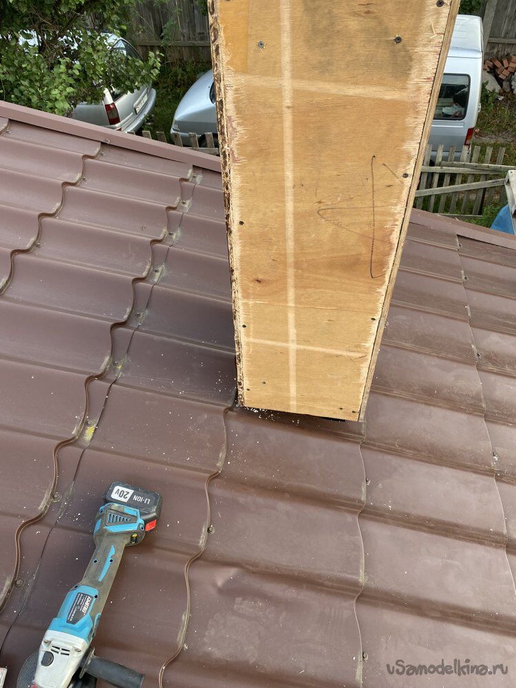 Изнутри помещения, приложив уровень к трубе, отметил на металле кровли примерное положение внутренней трубы, просверлил отверстия, чтобы обозначить положение, залез на крышу и болгаркой вырезал предварительное окошко,