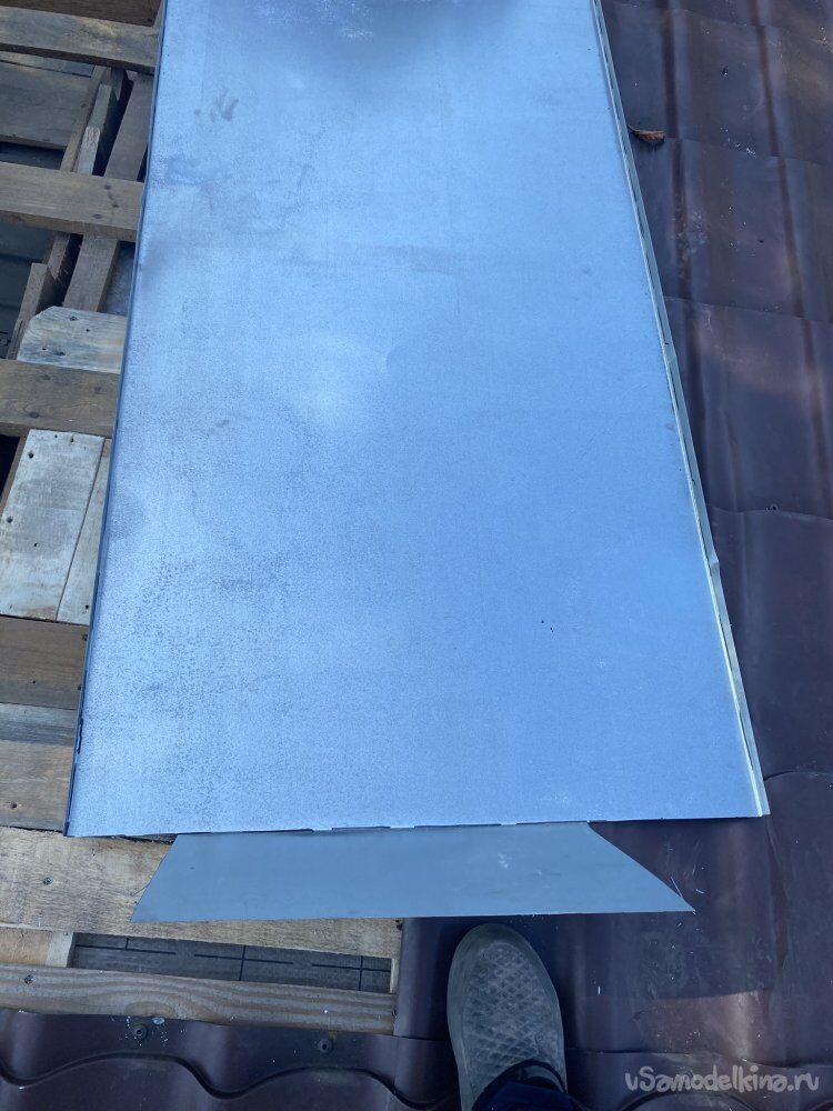Идея в том, что, после установки на место, и обустройства примыкания кровли к оцинковке, я прикручу недостающий профлист снизу, подсунув его под верхний, и тем самым дополнительно закрою планки примыкания.