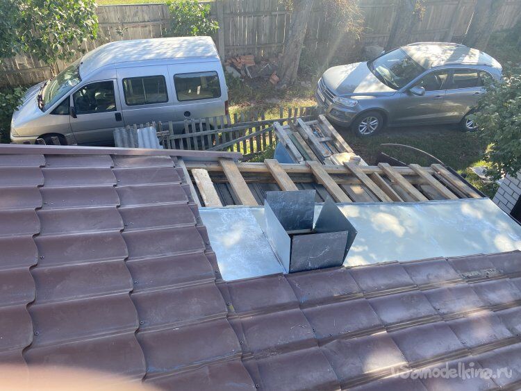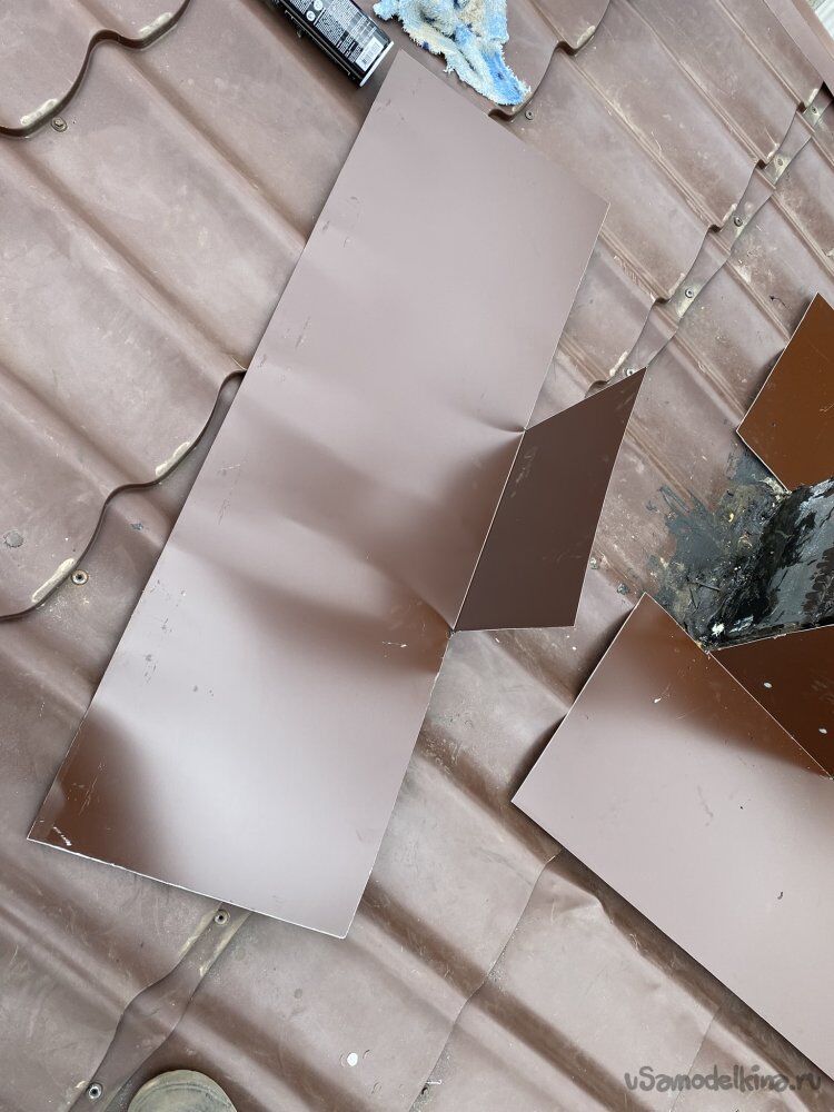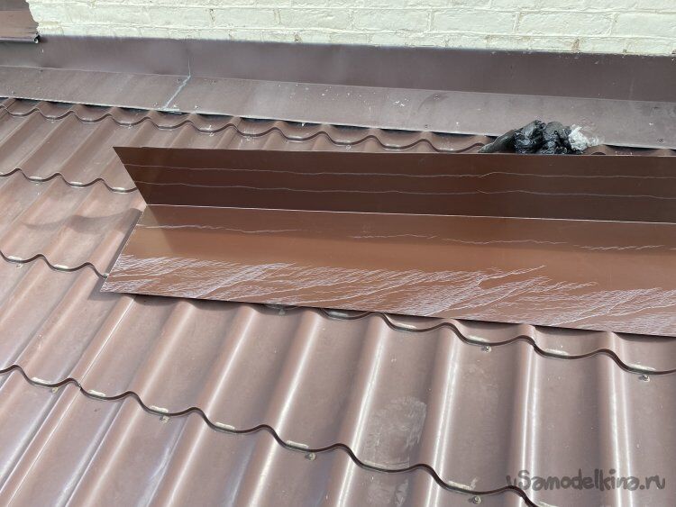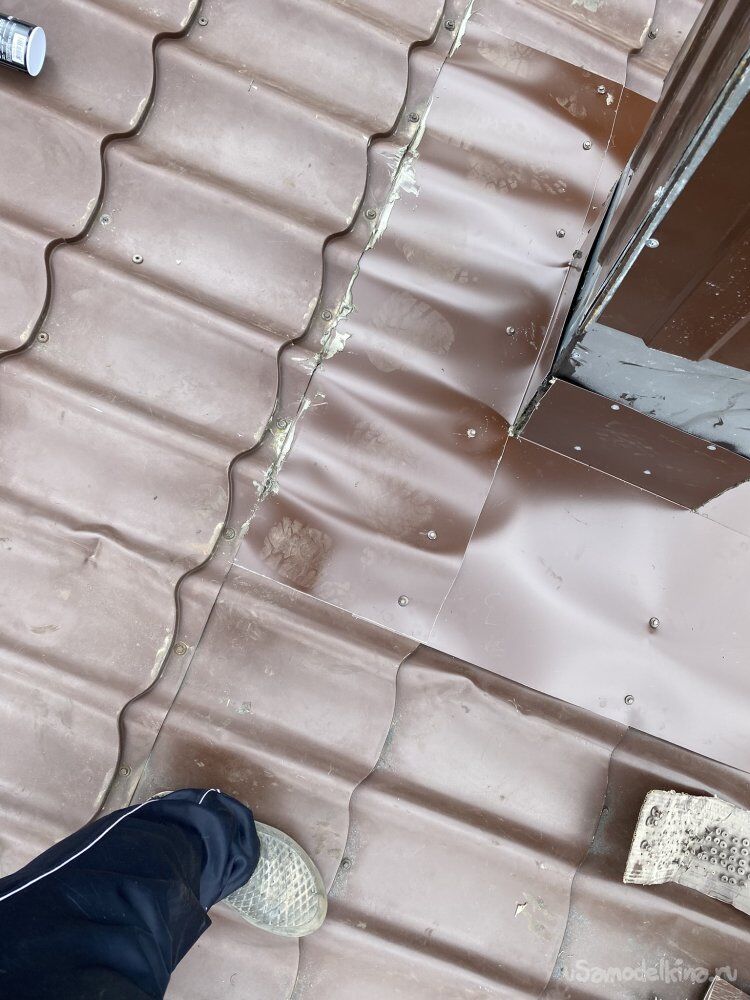 Начал монтаж примыкания. Сначала нижний, потом, с нахлёстом на него, боковые, потом верхний. Все элементы сделал в виде ендовы, с чуть загнутыми краями, предварительно высчитав их ширину так, чтобы ити загибы потом располагались ровно в центре продольных "горбов" металлочерепицы. Нижний лист сделал длиной до конца кровли. Так что, даже, если влага просочится сквозь примыкание, она стечёт в жёлоб по этой ендове под металлочерепицей: