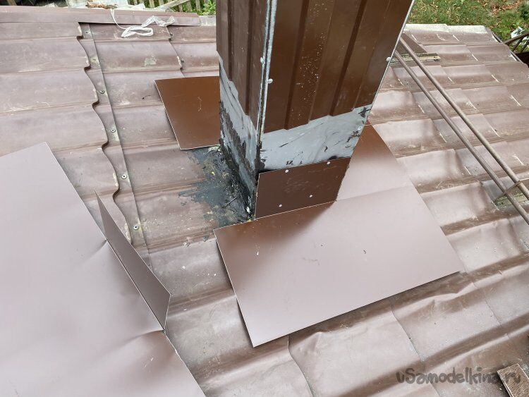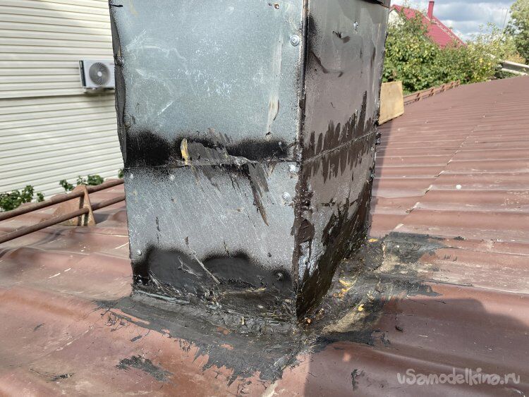 Установил дымоход. Корректировать наклон не пришлось - после того, как труба села на своё место, стенки короба оказались строго вертикальными. Пригнул боковые листы примыкания к дымоходу, приклеил их на силиконовый герметик, закрепил саморезами и обмазал герметиком все швы поверху. Нижние щели между дымоходом и металлочерепицей заполнил кровельным битумно-полимерным герметиком: