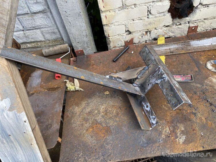 Для этого, из уголка 50х50х5, я изготовил несколько крепёжных конструкций. Один кронштейн будет закреплён на деревянном брусе-перемычке между колоннами террасы. Он получился сложной формы: