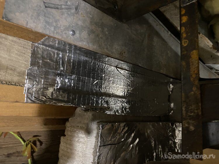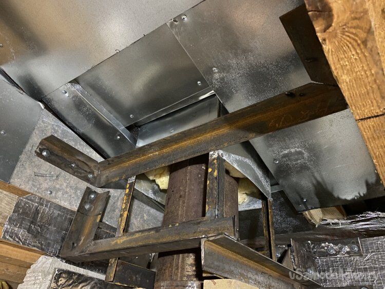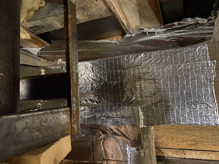 Перед установкой обклеил все деревянные конструкции алюминиевой фольгой, а те, которые расположены ближе к дымоходу, оббил заранее изготовленными элементами из жести-оцинковки. На этот раз к листогибу не ездил. Гнул киянкой и молотком, прикрутив к доске. Потом в эти же отверстия и крепил. ( Это, конечно, перестраховка! Ведь, вся конструкция будет плотно забита стекловатой при обустройстве потолка, но... Бережёного Бог бережёт, как говорится... ))))