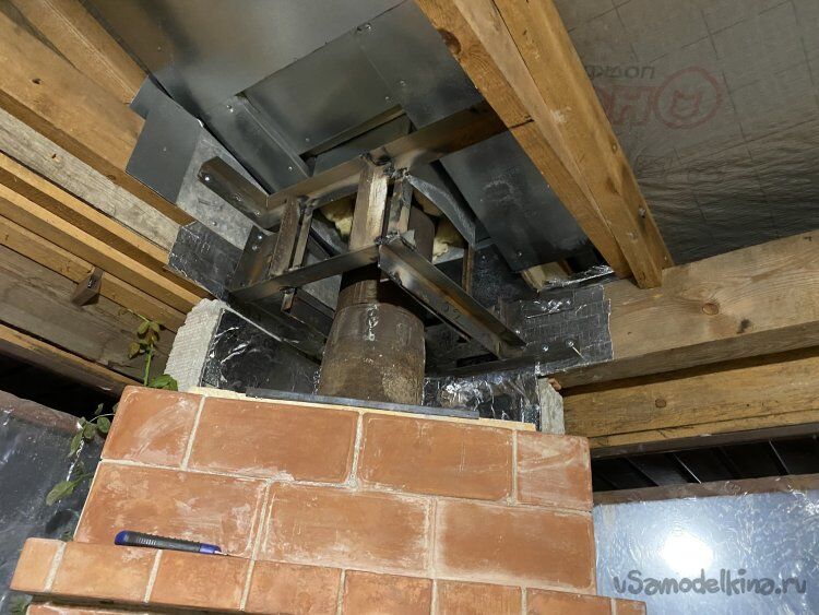 Теперь, когда дымоход стоит на своём окончательном месте, необходимо его надёжно закрепить изнутри к стропильной системе. Так, чтобы он не мог даже чуть-чуть шататься.