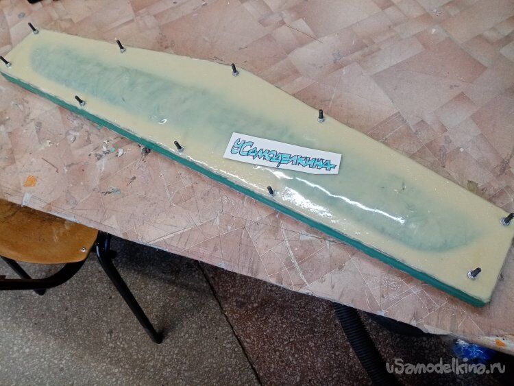 Не так давно изготовил матрицу для крыла маленькой гоночной модели. Уже обкатали. Изготовили по ней несколько крыльев. Но есть проблема. Корка матрицы получилась не жесткая. При формировании крыла нужно достаточно жестко обжать бутерброд, помещенный внутрь изделия. Поскольку для лучшего формования ядро крыла вырезается для оклейки стеклотканью со смолой на микрон больше нужного размера. Затем вся конструкция из пенопластового ядра с усилениями и оклеенное стеклотканью или углетканью помещается в матрицу и все это хозяйство сжимается. Желательно сильно. Что улучшает склейку ядра с обшивкой. Вот в этом моменте была недоработка. Матрица немного изгибалась и не позволяла увеличить внутреннее давление. Нужно увеличить жесткость половинок матрицы. Придется слегка нарастить слой стеклоткани и эпоксидной смолы на внешней поверхности верхней и нижней половинки матрицы. Казалось бы просто. Укладывай стеклоткань и наноси смолу. Но есть риск, что внешний слой при нагрузке может отслоиться от уже готовой корки. Но делать нечего попробую, что получится. Тут подоспела еще одна партия смолы. Нужно провести тесты на смешивание с отвердителем. Как не странно партия от партии отличается. Хотя не много, но есть риск не попасть в пропорцию. Поэтому при покупке каждого количества эпоксидной смолы провожу контрольный замес. Примерно десяти грамм. Есть конечно и другие способы проверки. Но я предпочитаю именно этот. Придется потерпеть сутки, убедиться что попал в нужную пропорцию. И так приступаю. Пробы проведены можно замешивать. Но хочу предварительно подготовить внешний слой матрицы. Устанавливаю в дрель самую крупную фрезу и начинаю резать слой смолы и стеклоткани на верхней части половинок матрицы. Наношу штрихи прямо и под наклоном. Тешу себя мыслью что таким способом добьюсь хорошей склейки старого слоя с новым. Перед самым замесом вспомнил. Что остались отверстия от винтов стяжки половинок матрицы. Аккуратно заклеиваю пластилином. Из остатков стеклоткани нарезаю кусочков в размер. Главное попасть в ширину. На бортики не нужно наклеивать. Вот теперь все готово. Замешиваю сто грамм смолы. Почему именно этот вес?. Для меня комфортно работать. Не торопясь и тщательно пропитывая стеклоткань смолой. Есть тонкость. Пропитывается не сразу. С некоторой задержкой. Как раз времени хватает размазать сто грамм и нанести три слоя стеклоткани до начала загустевания состава. Затем еще замешиваю такое же количество. Укладываю три слоя стеклоткани. После укладки стеклоткани на двух половинках формы. Решил еще немного увеличить толщину слоя. Замешиваю смолу с пудрой мрамора и заливаю поверх. Немного разгоняю кисточкой по форме. Укладываю половинки на ровную поверхность. Состав сам растечется по ванночке формы. Моя небольшая модернизация полностью застыла. Нужно досверлить замазанные пластилином отверстия до места. Подбираю из набора сверло нужного диаметра. Сверлю насквозь. Пришлось покупать болтики стяжки слегка большей длины. Соединяю формы, устанавливаю болты стяжки. Для гарантии выдерживаю форму еще пару дней до полного отвержения смолы. Режем новое ядро крыла из пенопласта укладываем в матрицу и от души закручиваю болты фиксации. Сомнения гложут. Вдруг треснет все. Прямо руки тряслись. Но все закончилось хорошо. Крыло обжалось как нужно 