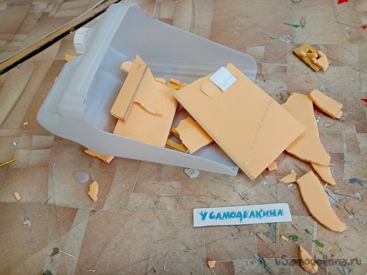 Поскольку мы в моделке постоянно пилим, строгаем и режем различные материалы, проблема перемещения мусора из разных уголков помещения в усовершенствованный мусорный контейнер стоит особенно остро. Тут как на зло, вышел из строя погрузочный совок. В пылу уборки наступили на страдальца. Временно заклеил скотчем и довел уборку до логического завершения.