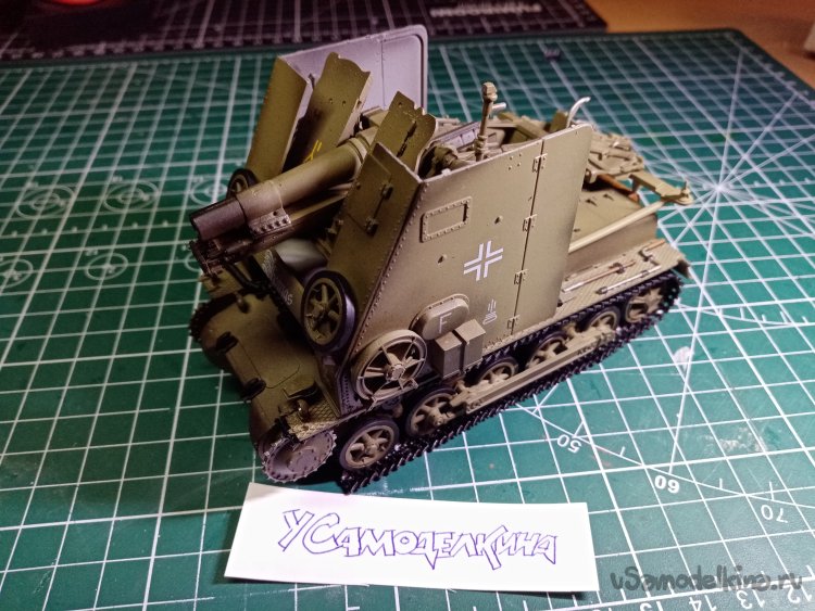 Опять, копаясь в коробках от оставшегося наследия стендового направления нашего кружка, обнаружил очень интересный танк. В интернете нашел не менее интересную фотографию этого сооружения. На основную платформу легкого танка немцы приспособили гаубицу. Она могла вести боевые действия с носителя, также её можно было снять и использовать как обычное орудие крупного калибра. Очень интересная штуковина. Как всегда в коробке куча мелких деталей и немного сделанного из конструкции. Очень заинтересовала она. Решил доделать. В домашней лаборатории очень долго разбирал это крошево мелких и крупных деталей. Прихожу к выводу, можно собрать, кажется все на месте по мелочи. Только вызывают сомнение траки гусениц. Как не считал откушенные и оставшиеся на литниках звенья, не могу понять, хватит ли на всю длину гусениц. Корпус собран и частично окрашен. Некоторые детали установлены неправильно. Осторожно отрываю с приклеенных мест. Как всегда, где не нужно приклеено «насмерть». Осторожно подрезаю ножом и отделяю. Приклеиваю в нужное место. Кресло механика водителя и весь антураж немного поправляю. В мелочевке нашлись даже рычаги управления. Закрепляю по местам. Немного повозившись, заталкиваю в носовую часть корпуса танка. Приклеиваю, также подгоняю деталь днища. Броневую плиту режу просто ножом для творчества. Корпус в носике готов. Есть вся мелочь по верхней части носа, фары, крюки, какие-то штуки неизвестные. Сообразуясь с инструкцией, нашел и приклеил на нужные места. Верхние опоры гусениц установил по местам, нет одной стойки колесика. Не беда, выстрогал из литника похожую детальку. Нижние опорные катки и ведущие колеса тоже не потерялись. Инструкция конечно невнятная. Рисованная от руки. Хотя если подумать, можно определить, откуда и куда чего устанавливать. Кстати, облоя очень мало. Подготовил к монтажу всю опорную часть шасси. Начинаю устанавливать на корпус. Детали насаживаются на оси с большим припуском. Приходится постоянно держать и поправлять прямолинейность колес. Какая досада, оставил быстросохнущий клей в моделке. Вонючий он гад, но хватает хорошо. Продолжительная возня с колесами наконец завершена. Ровно установил. Отвлекаюсь от корпуса. Малость поковыряю пушку. На лафете деталька приклеена наоборот. Осторожно отрезаю. Подчищаю края, приклеиваю в нужное положение. К передней части лафета приклеены оси колес, и криво. Отрезаю, зачищаю, переклеиваю. Ствол орудия склеен с щелями. Разнять детали не получилось. Немного мажу шпаклевкой. Оставляю сохнуть. Есть тонкость. Шпаклевать небольшие щели лучше кисточкой. Развожу шпаклевку растворителем до состояния сметаны. Наношу кисточкой. Хорошо размазывается и проникает в глубину, там и закрепляется. Одно правило не наносить толстым слоем. Если все правильно развести и нанести, практически нет утяжки по фону. После застывания, время не много больше, чем густой. Нужно большую часть валика просто срезать ножом, статки шлифануть шкуркой. Орудийный щит немного поломан. Склеиваю. Перехожу на корпус. Нужно оформить заднюю часть. Валы, выхлопная труба с глушителем и некоторое количество шанцевого инструмента. Отрезаю от литников, приклеиваю на место, сверяясь с «дубовой» инструкцией. Защитную решетку на глушитель отрезаю от травленки и сгибаю. Поторопился однако, его приклеивать нужно в 