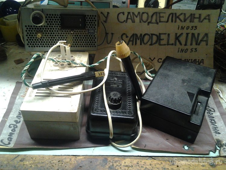 Навеяно статьей " Ремонт выжигателя...", автор vedernikov.vital, ссылка - https://usamodelkina.ru/25379-remont-vyzhigatelja-pvd-3-vtoraja-zhizn-staryh-veschej.html. Добавлю немного из своего опыта, т.к. с этой техникой приходилось сталкиваться во время работы на СЮТ (Станция Юных Техников, сейчас называется как-то по другому), где вел радиокружок (тоже сейчас название другое). Целый ряд кружков из отдела НТМ (начальное техническое моделирование) пользовались на занятиях выжигателями (далее по тексту - ВЖ), а народ там не очень-то аккуратный - тут и падения со стола, и обрывы проводов, и даже попадание в кастрюлю с клеем... Рис.1. Ес-но, я лично ремонтом этой ерунды не занимался (Дедушке по сроку службы не положено!), а пацаны кривились и упирались. Со стороны интересно было наблюдать, как 15-летняя девчонка охмуряет 17-летнего оболтуса, что бы тот отложил свой УНЧ или ЦМУ и занялся ее ВЖ. Рис.2. Но вернемся к теме. Описанный в статье ПВД-3 далеко, КМК, не самый лучший вариант прибора (я имею ввиду выжигатели). Регулировка достаточно больших токов, проходящих через неспециализированный скользящий контакт, приводит к нестабильной работе, а то и к вони, дыму и искрам. Приведенный в статье вариант ступенчатой регулировки требует достаточно мощного тумблера (в автотракторной технике их хватает, но они, заразы, дорогие...). Нами использовался вариант с регулировкой (подборкой методом проб) длины жала - собственно нагревателя, нихромовой проволочки. При этом ставились резьбовые контакты от клемников для минимального сечения провода, а если попадался маааленький керамический клемник, то ставился целиком. Рис.3. Некрасиво? Ну, у нас не салон красоты с педикюром и т.п.. А вот это другой вариант ВЖ, здесь регулировка тока с помощью отводов от выходной обмотки и их соответствующей коммутации. Рис.4. Надежно, широкий диапазон регулировки, а если этот питатель ВЖ использовать как БП к чему-нибудь еще, то вообще полезная вещь. Причем гнезда для напряжений до 1.5 В диаметром 5 мм, выше - 4 мм, т.е. штеккер диам. 5 мм от собственно ВЖ в более высоковольтное гнездо просто не всунешь... Рис.5. И еще вариант ВЖ - с плавной регулировкой по первичке. Рис.6. Простенько и со вкусом! Регулируемый ток на два порядка ниже, чем в ПВД-3, поэтому никакой экзотики - стандартный проволочный переменный резистор, ес-но, хорошо изолированный. Если что - меняется без проблем, хотя что с ним сделается... Рис.7. Ну и еще - техническое извращение. Как известно тем, кому приходилось ковыряться с переделками компьютерных БП в ЛБП или вообще в регулируемые БП, получить в них на выходе менее примерно 2,5 В проблематично. Когда у нас возникла задача запитать резак для нарезки протектора на наваренной резине, понадобился агрегат, принципиально похожий на ПВД-3, но намнооого мощнее: напряжение на выходе единицы вольт и ток в десятки(!) ампер. Конечно, там же режущий элемент - это не нихромовая проволочка, как на обычном ВЖ. Так вот, пацаны в регулируемом БП на основе компьютерного (напоминаю, там регулировка по первичке с помощью ШИМ) подключили к выходной 5-вольтовой обмотке (пределы регулировки примерно 2,5...10 В, ток более 20 А) до выпрямителя(!) доп. трансформатор на ферритовом сердечнике (от такого же БП, т.е. совсем небольшой) с коэф. трансформации около 6 (понижение напр.) и выходной обмоткой из толстой медной фольги, 1,5 витка, выводы из термостойкого провода БПВЛ, не помню, 10 