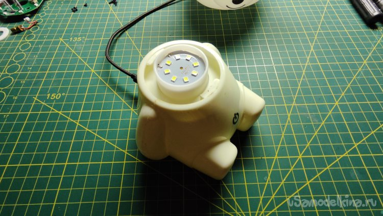 Поворотом снимаем рассеиватель. Видим восемь включенных параллельно светодиодов без следов прогара.