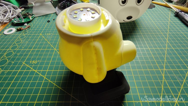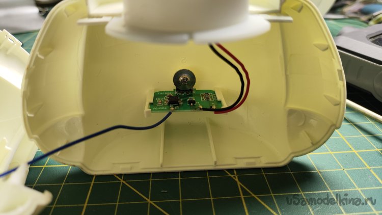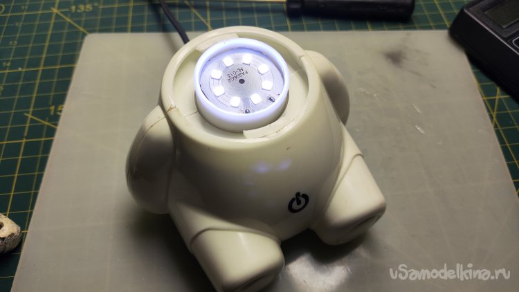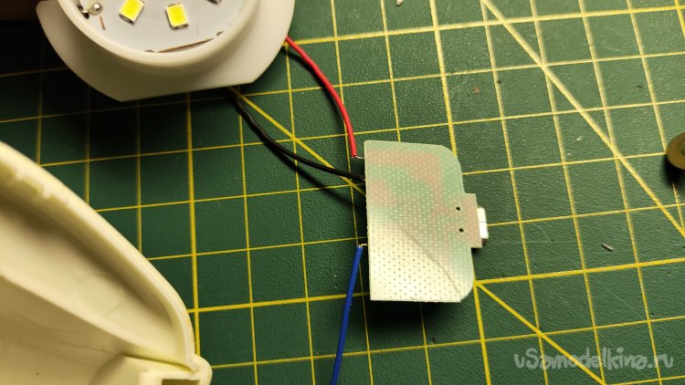 Припаиваю на место отпаянные ранее провода. Проверил, все работает. Собираю светильник. Опять проверка. При касании сенсора светильник устанавливает три яркости свечения, при каждом касании все ярче. При четвертом касании выключается.