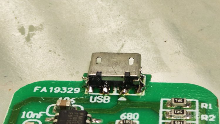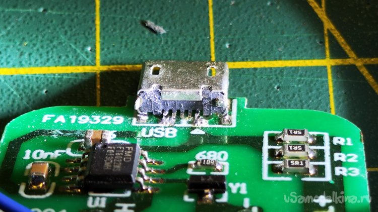 Разъем пропаян паяльником с тонким жалом. Как контакты пропаяны, так и сам корпус, который тоже в двух точках оторвался от платы.