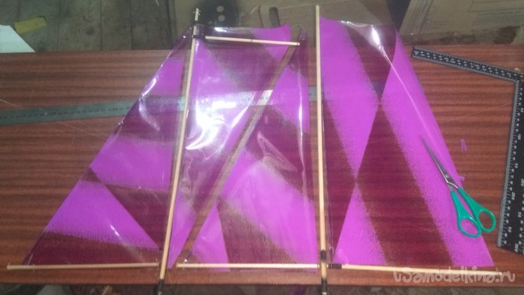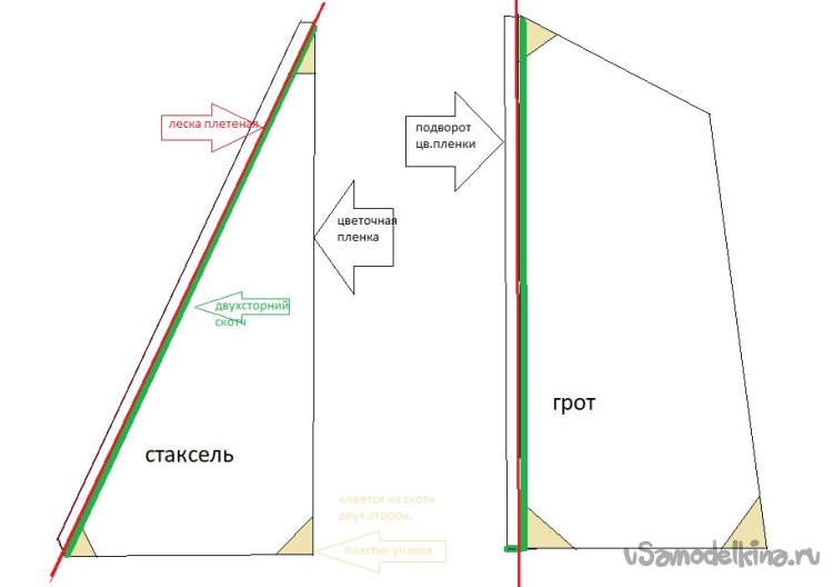 На цветочной пленке расчерчиваем парус по шкоторене где будет укладываться леска добовляем 5мм на подварот в уголках из упаковочного пластика делаем 3-4 отверстия для лески к нижнему уголку упаковочного пластика к нижнему отверстию привязываем леску на узел, в другие отверстия продеваем леску, и приклеиваем двухсторонним скотчем этот пластиковый уголок к нижнему углу паруса где будет идти шкаторина с леской