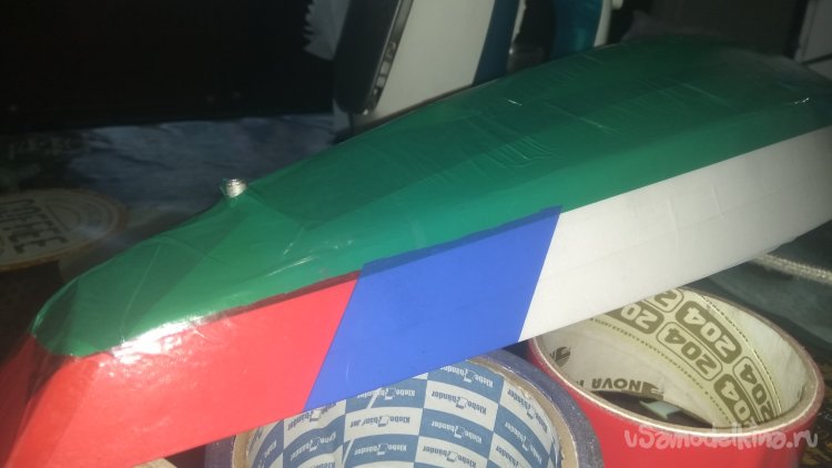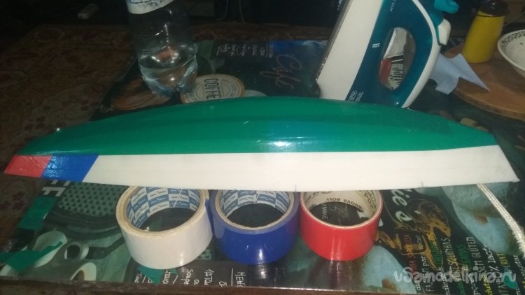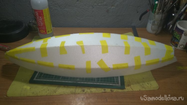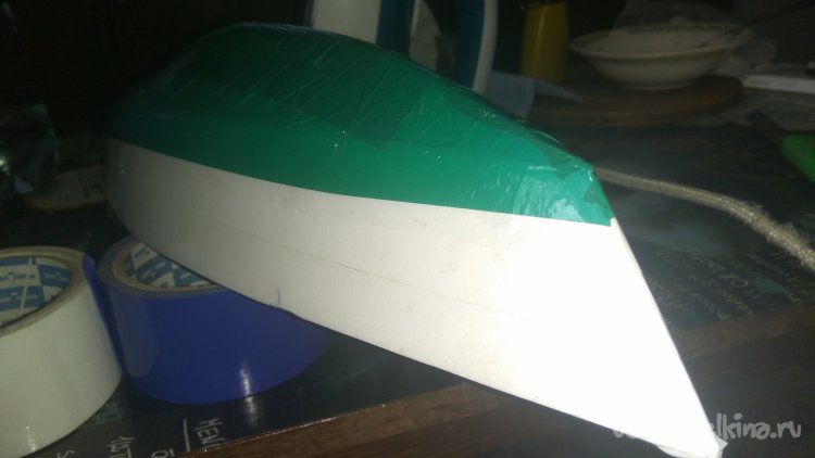 Возвращаемся к нашему корпусу из потолочной плитки. Берем цветной скотч и утюг и оклеиваем корпус скотчем разглаживая утюгом загибы и складочки. Температура утюга должна быть такой чтобы скотч формировался но не прожигался можно потренироваться на куске плитки со скотчем , чтоб не попортить готовый корпус шхуны.
