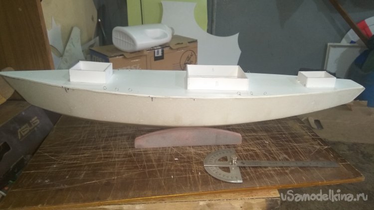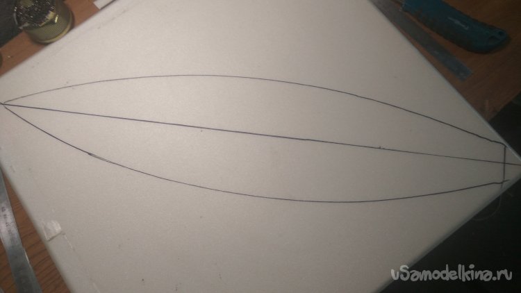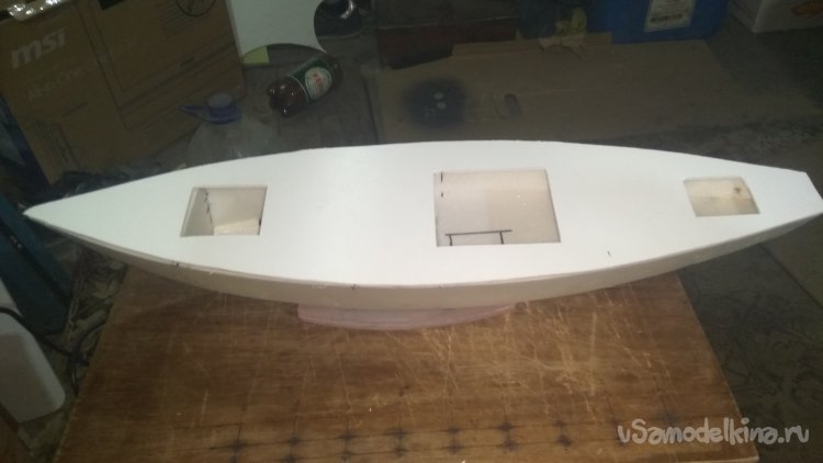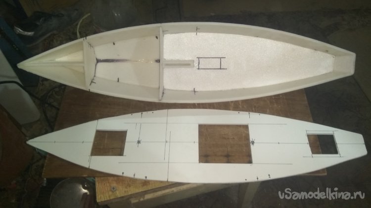 Берем лист пвх пластика обводим по нему корпус Вырезаем палубу.