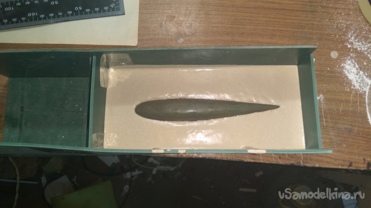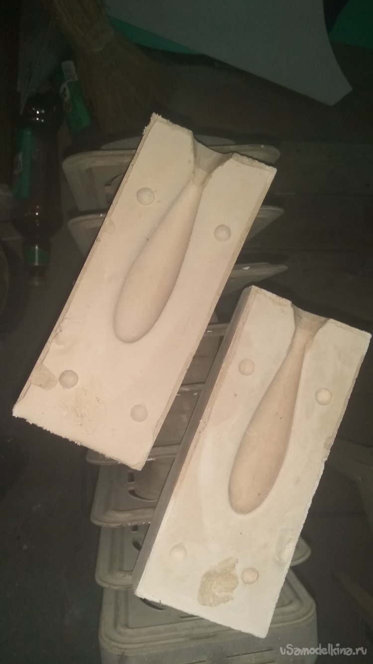 Заливаем гипсом половину формы и укладываем мастер заготовку из пластилина так чтобы она погрузилась в гипс на половину даем схватиться гипсу после делаем направляющие сверлом 10мм руками высверливаем неглубокие отверстия в гипсе от 2 до 4 шт. глубиной 2-3 мм от заточки сверла. вытряхиваем гипсовую стружку от отверстий. берем жидкое мыло или моющие средство для посуды, кисточкой наносим на гипс ,пластилин и отверстия для направляющих, после заливаем второй порцией гипса. После высыхания гипса разбираем опалубку формы и разделяем на две половины по следам мыльного раствора,извлекаем пластилиновую заготовку, делаем напильником ливневки куда будет затекать свинец, и даем гипсу хорошо просохнуть пару дней на солнце или прогреть в духовке 30-60 мин.