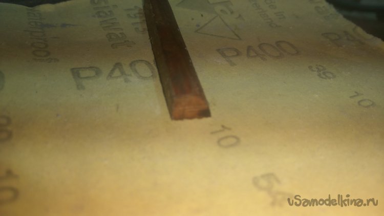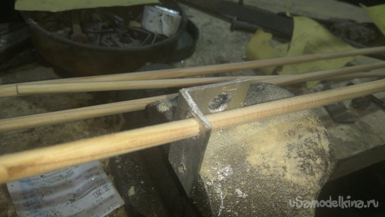 Дальше корпус и палубу откладываем в сторону, и приступаем к изготовлению из штапика делаем мачты и гики .Для этого нам понадобится.пластинка с отверстием 8 мм.,дрель.и шкурка № 150 .